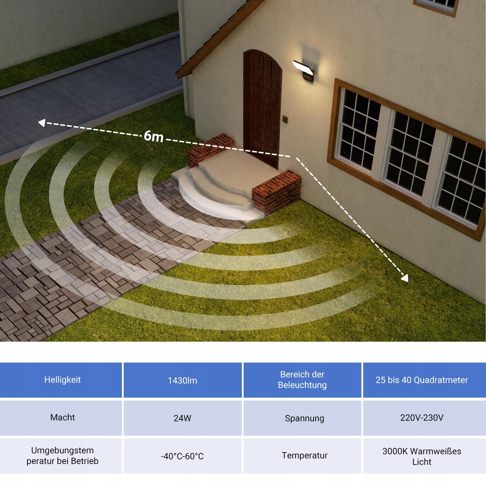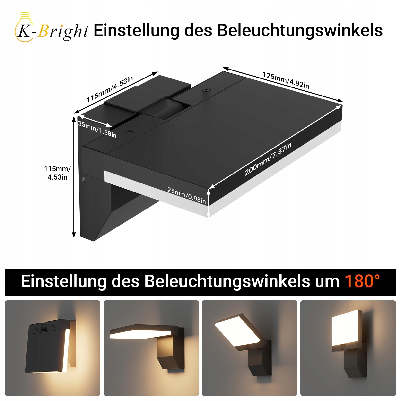 Obrót pionowy 180°: kinkiet zewnętrzny jest obracany o 180° za pomocą zawiasu i może być elastycznie dostosowany do Twoich potrzeb oświetleniowych – możliwe jest skierowane oświetlenie.
