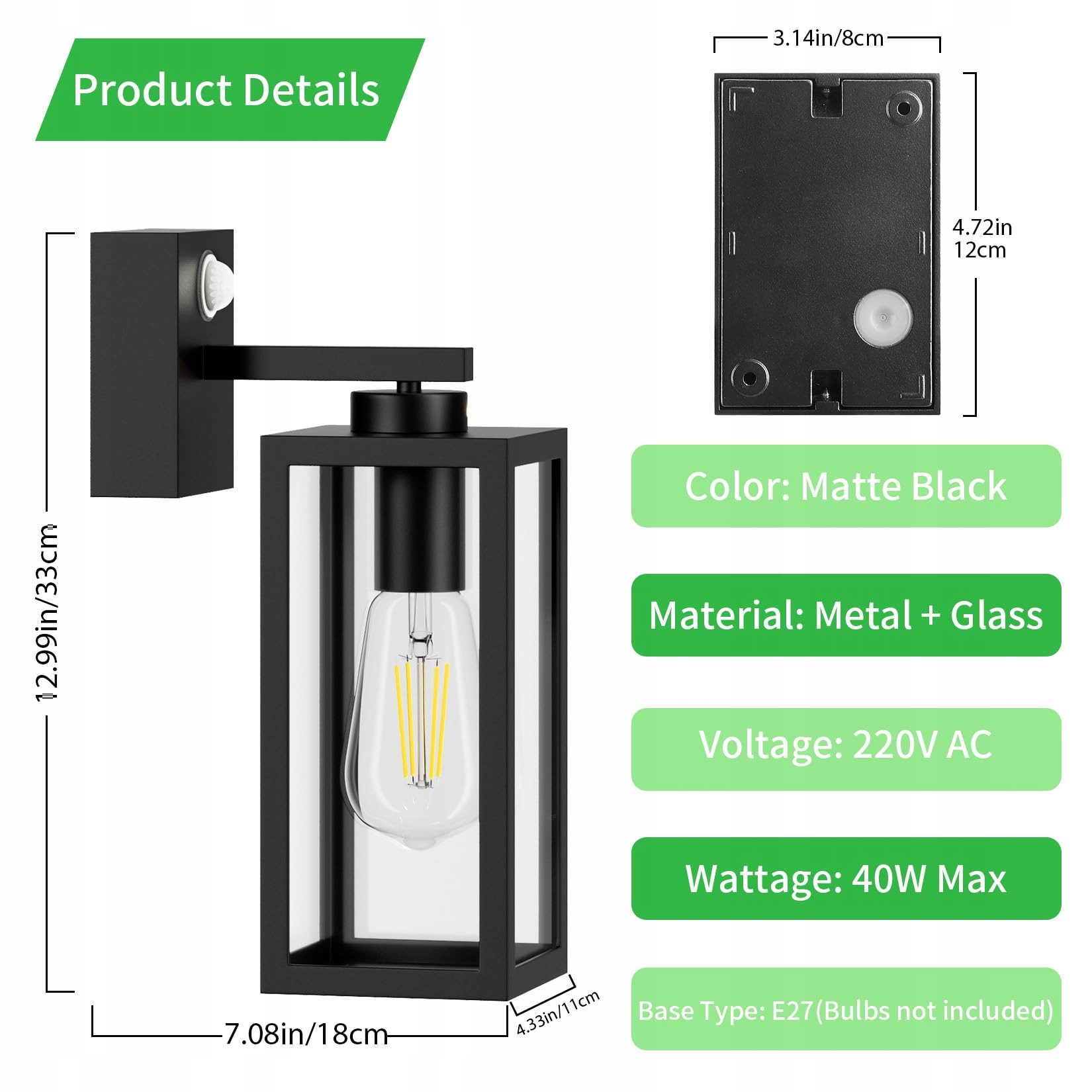 Oprawka/żarówka: Lampa ścienna latarnia z czujnikiem ruchu ma wbudowaną standardową oprawkę E27, do której pasuje większość dostępnych na rynku żarówek E27 (maks. 40 W), w tym standardowe i ściemnialne żarówki. Uwaga: żarówki nie są dołączone do zestawu.