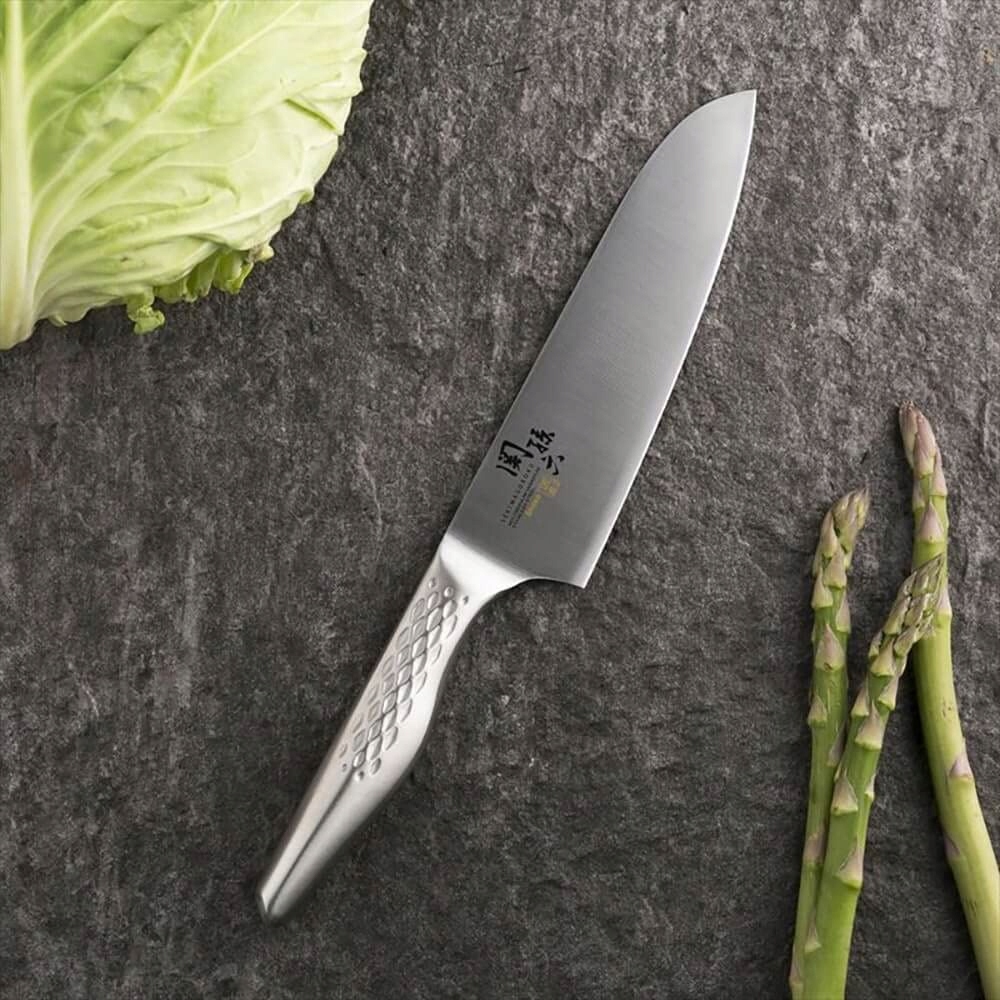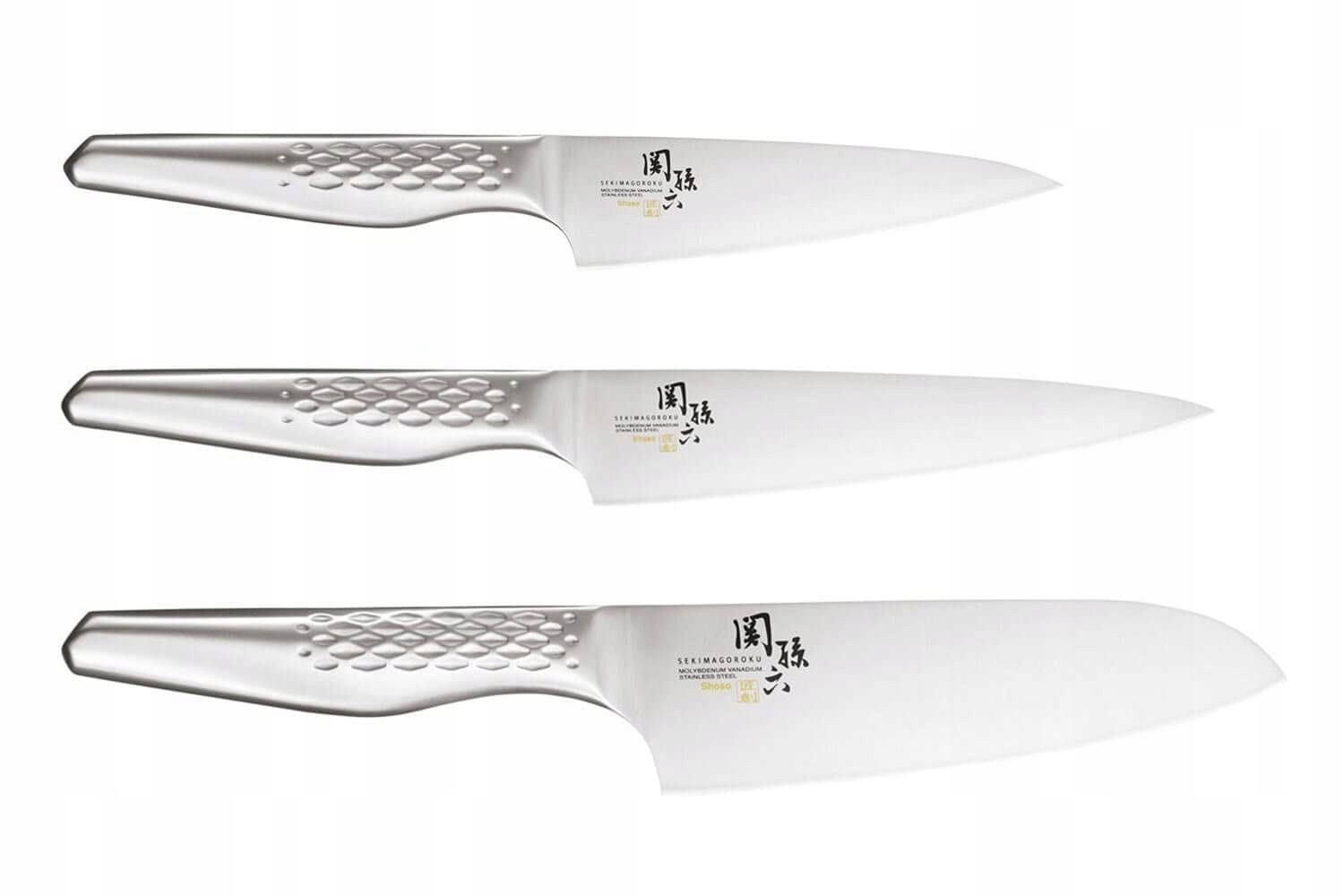 Zestaw noży KAI Seki Magoroku Shoso 3 szt. - nóż uniwersalny 12 cm, nóż uniwersalny 15 cm, Santoku 16,5 cm - stal 5CR15MoV 56 (±1) HRC - uchwyt ze stali nierdzewnej 18-8 w wzór rombów - wyprodukowano w Japonii