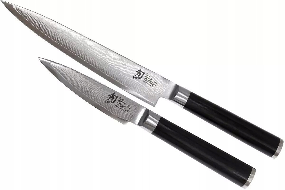 KAI Shun Classic japoński nóż kuchenny 2-częściowy - Nóż uniwersalny 15 cm długości ostrza + Nóż biurowy 9 cm długości ostrza - Nóż damasceński 32 warstwy VG MAX rdzeń - 61 (±1) HRC - Zestaw noży kuchennych z Pakkaholz