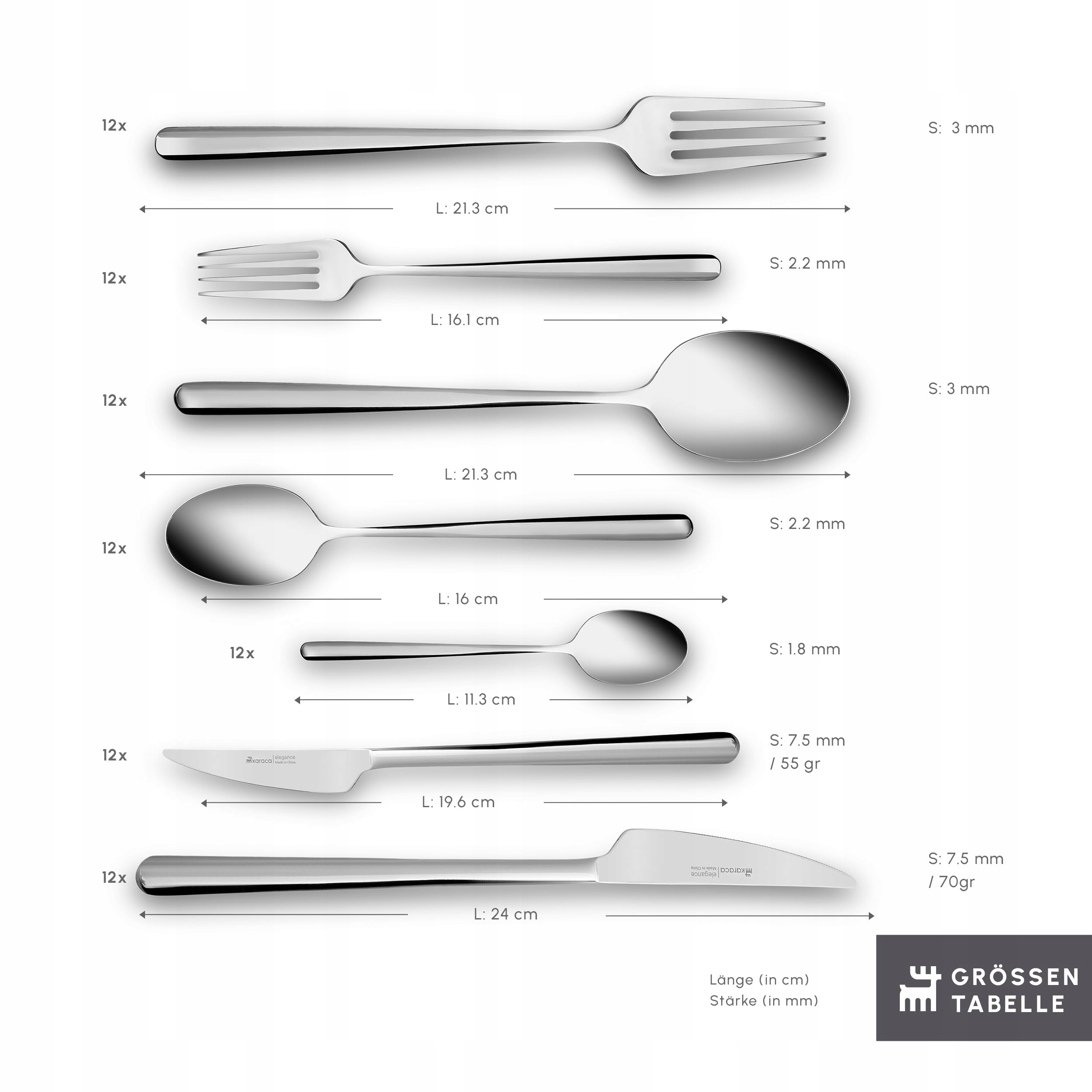 Kompletny zestaw 84-częściowy: Ten 7-częściowy zestaw sztućców zawiera po 12 sztuk każdego widelca (21,3 cm), widelca do sałatek (16,1 cm), łyżki (21,3 cm), łyżeczki do herbaty (16 cm), łyżeczki do deserów (11,3 cm), noża do jedzenia (19,6 cm) oraz noża stołowego (24 cm).