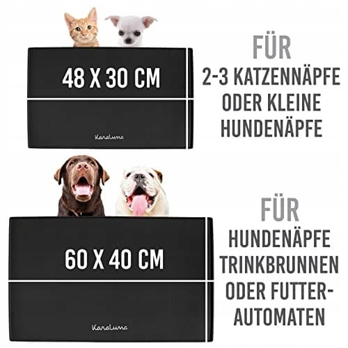Na podkładce pod miskę o wymiarach 48 x 30 cm mieszczą się 2-3 małe miski do karmienia dla kotów lub psów. Na dużej podkładce pod miskę o wymiarach 60 x 40 cm mieszczą się duże miski, fontanny do picia, automaty do karmienia lub ekspresy do kawy.