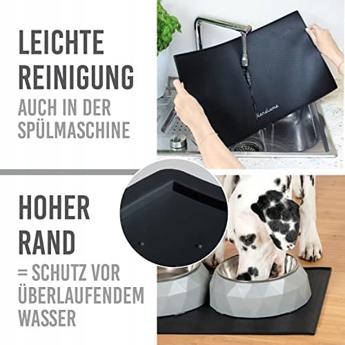 Dodatkowo wysoki wewnętrzny rant zapewnia, że woda i jedzenie pozostają na silikonowej podkładce. Dzięki podkładce KaraLuna Twój podłoga jest chroniona i pozostaje czysta i sucha.