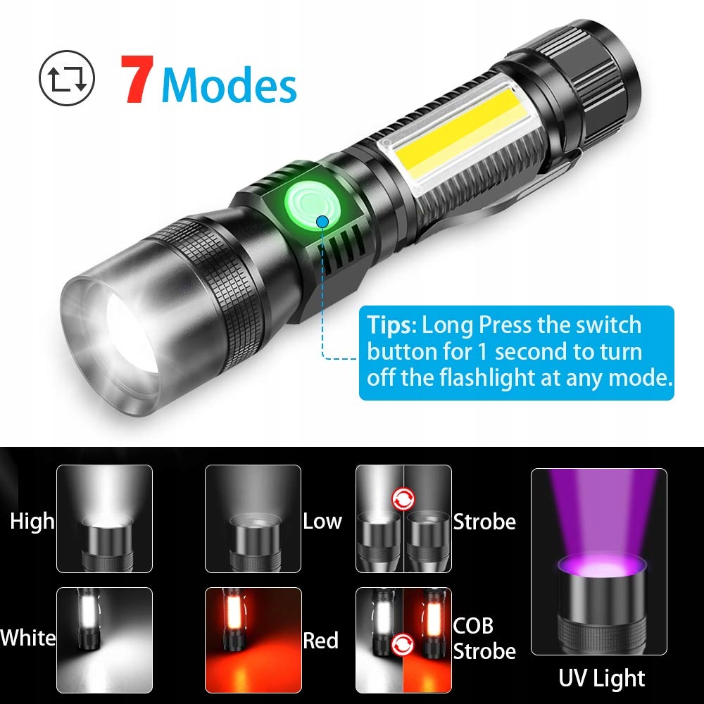 7 Trybów Latarki: Silne białe światło - Niskie białe światło - Światło UV - COB białe światło - COB czerwone światło - SOS czerwone i czerwone światło. Powiększanie / pomniejszanie latarki przez rozciąganie korpusu światła. Wybierane są okrągłe reflektory i używane do oświetlenia dużych powierzchni. Lub użyj reflektora przeciwodblaskowego do obserwacji na daleką odległość