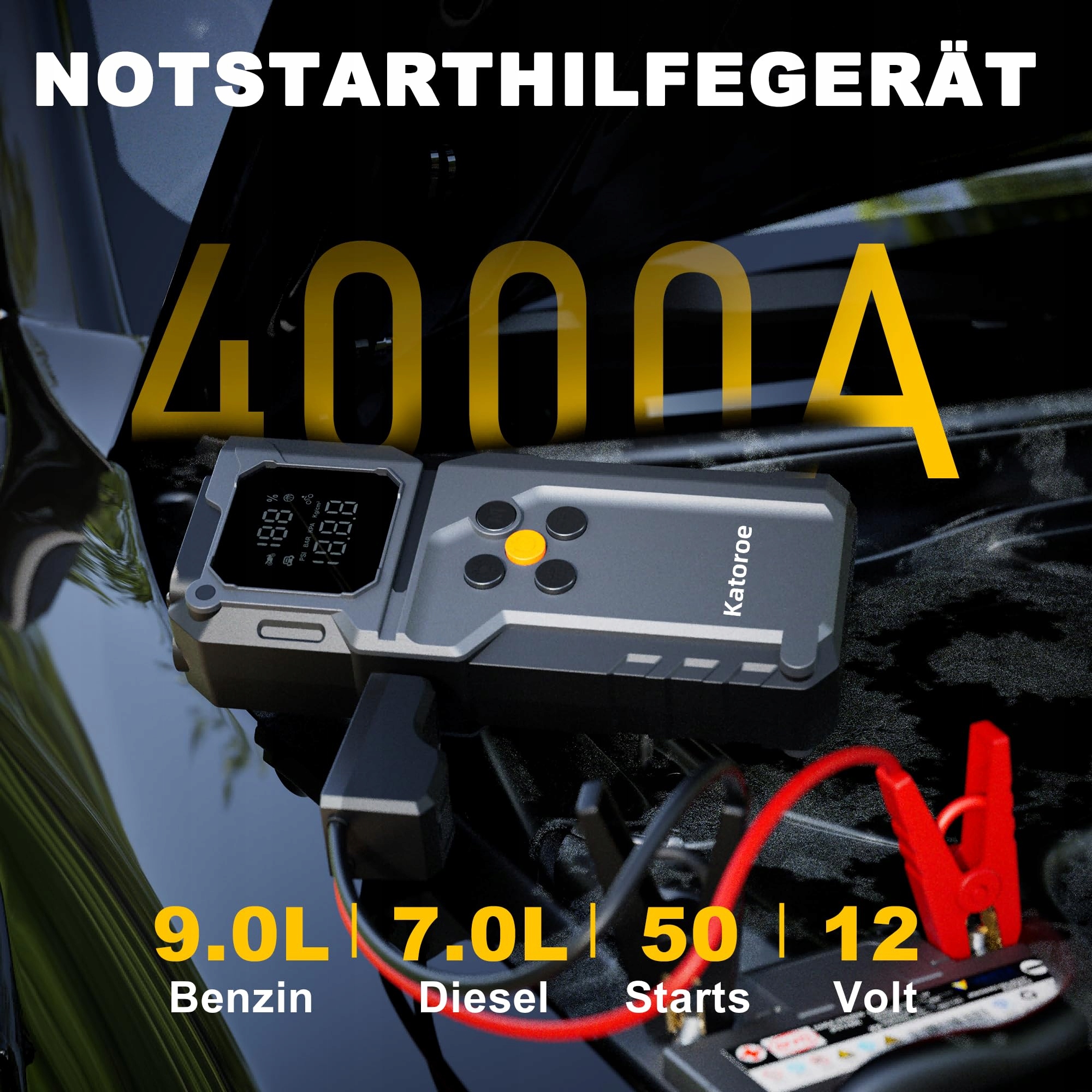 KATOROE Powerbank do rozruchu samochodu z kompresorem 150PSI, 4000A Rozrusznik samochodowy do wszystkich benzyn i 9.0L silników Diesla z LCD i wielofunkcyjną latarką