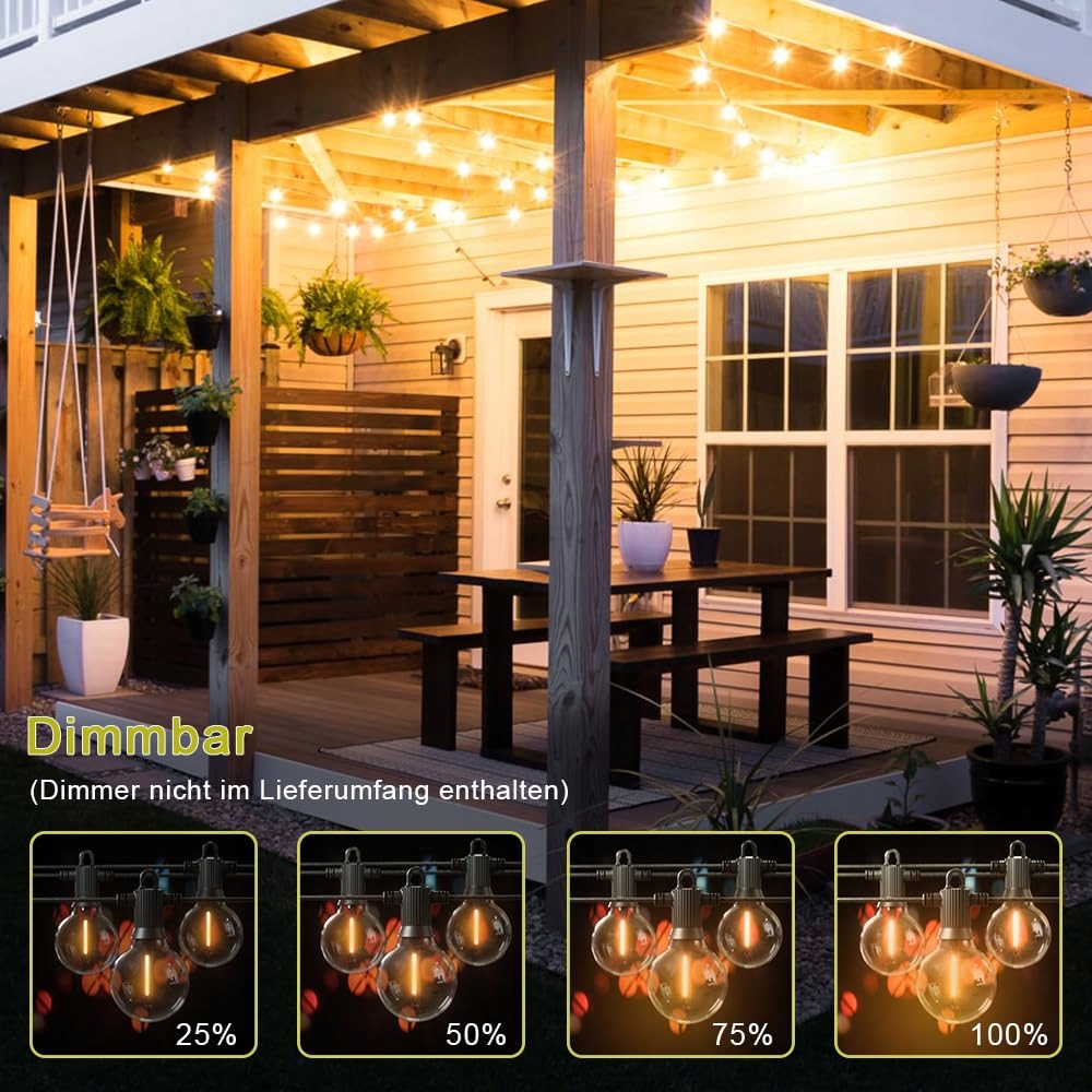 [Dimmowalna Ciepłobiała Lichterkette do Ogrodu] Nasze lichterketten do użytku zewnętrznego mają dimmowalne oświetlenie ciepłobiałe 2700K, które tworzy ciepłą, komfortową i przytulną atmosferę. Działa z większością dostępnych na rynku ściemniaczy (Nie dołączone do zestawu). Trwały przewód oświetleniowy ma wysoką elastyczność i odporność na temperaturę, co zapewnia długotrwałe i całoroczne użytkowanie.