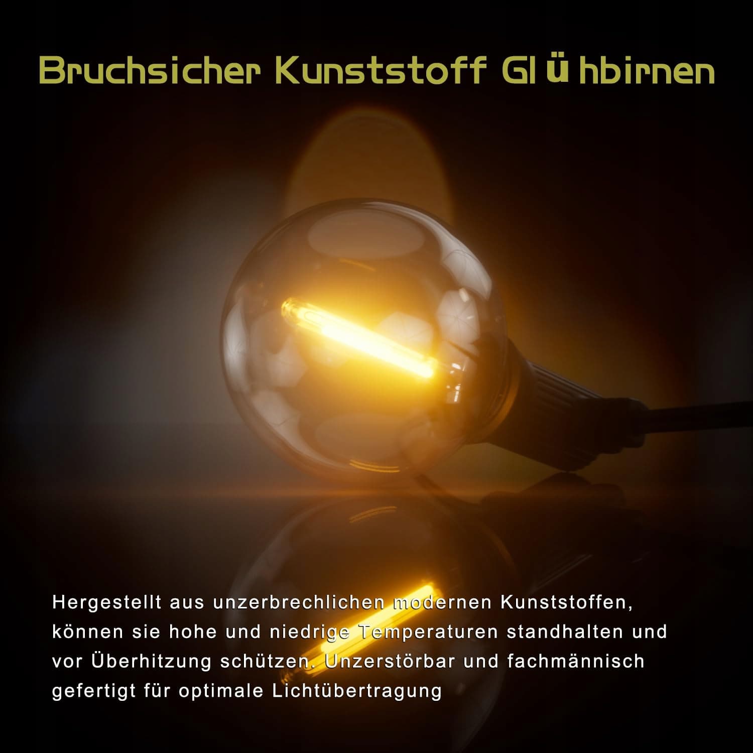 [IP65 Wodoodporna Zewnętrzna Lichterkette] Żarówki LED Lichterkette Außen są wykonane z nietłukącego się plastiku zamiast kruchego szkła. Zostały one przetestowane pod kątem odporności na stłuczenia, co gwarantuje dłuższą żywotność. Odporna na warunki atmosferyczne i wodoodporna lichterkette IP65 umożliwia użytkowanie nawet w deszczowe, wietrzne lub mokre zimowe dni.