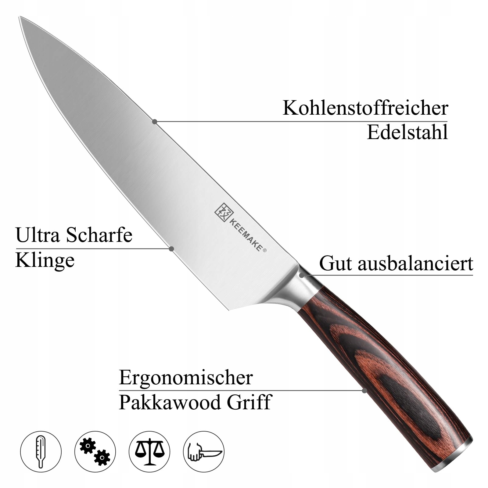 Ergonomicznie uformowany uchwyt: Uchwyt wykonany jest z pięknego drewna Pakkaholz. Oferuje miękkie i przyjemne uczucie w dłoni. Niezależnie od tego, czy jesteś profesjonalnym kucharzem, czy początkującym w kuchni, ten zestaw noży zapewnia komfortowe i przyjemne doświadczenie gotowania.