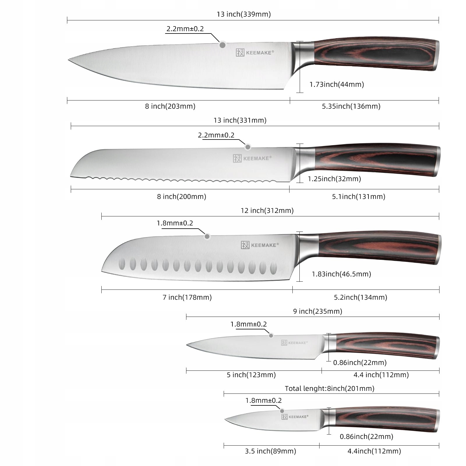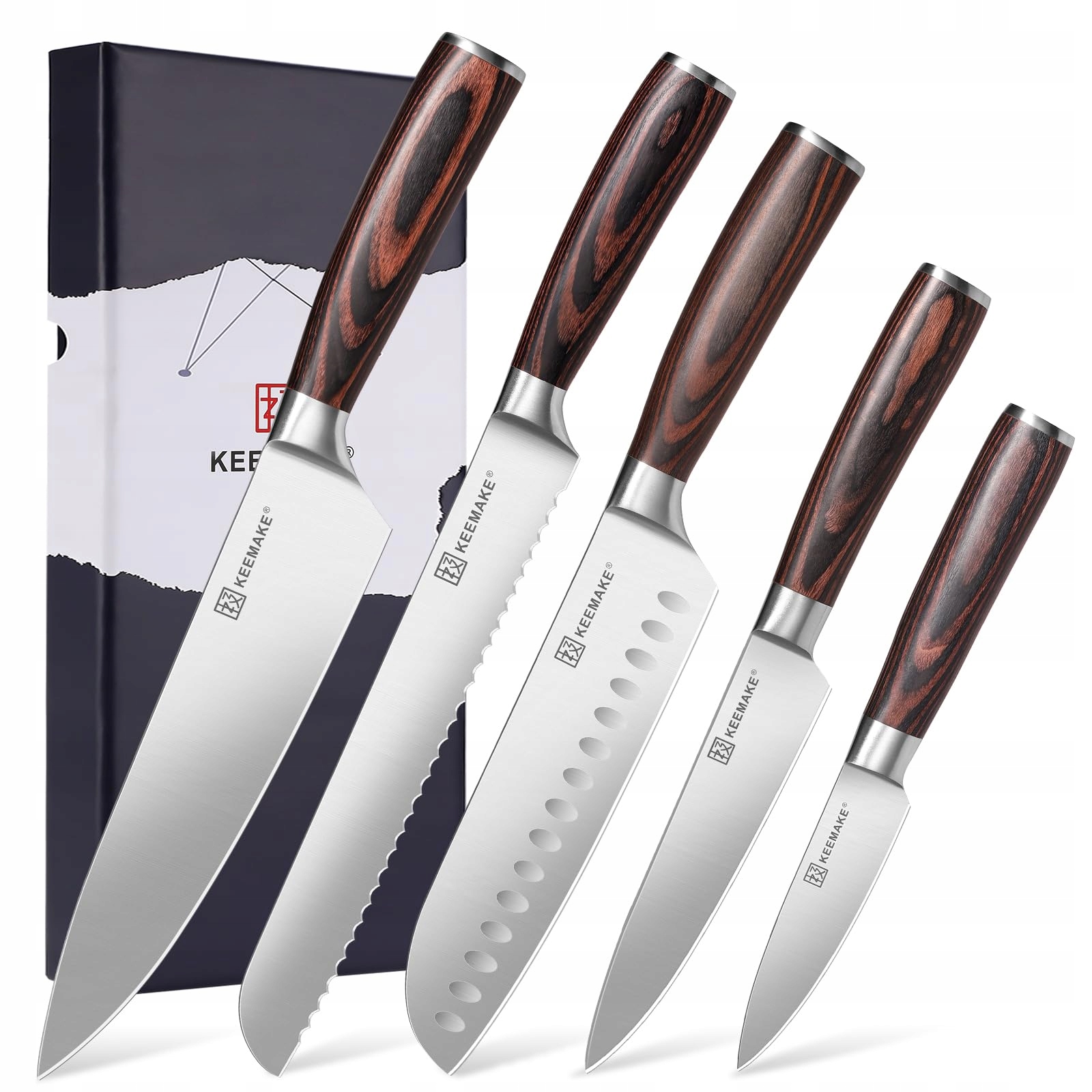 Zestaw noży KEEMAKE 5-częściowy, zestaw noży kuchennych o ostrych ostrzach ze stali nierdzewnej, profesjonalny zestaw noży kucharskich z ergonomicznym uchwytem z drewna Pakkaholz