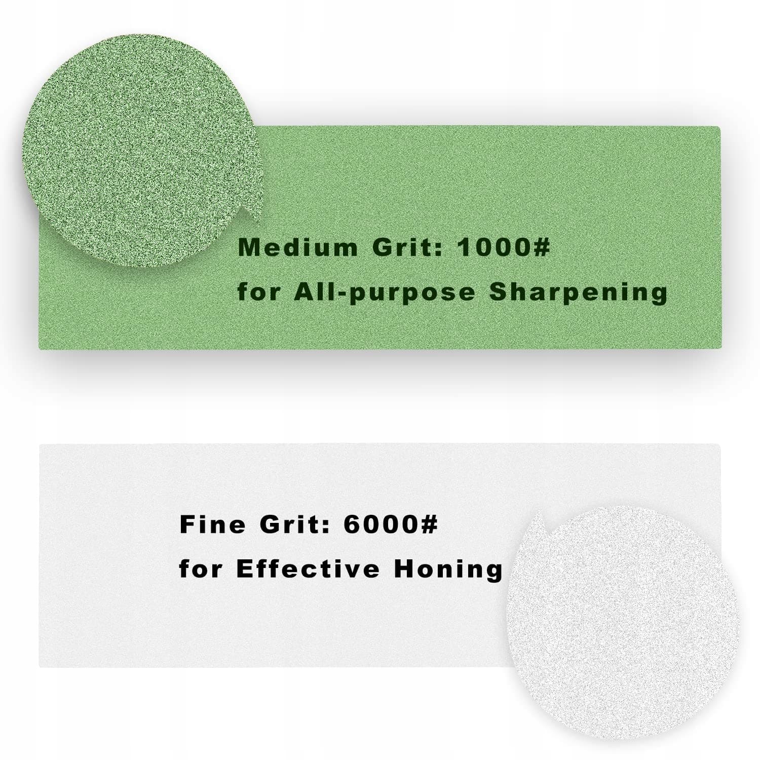 Uniwersalny kamień szlifierski o gradacji 1000 i 6000. Strona o średniej gradacji 1000 może pomóc w naprawie małych ubytków i wzmocnieniu krawędzi noża. Strona o drobnej gradacji 6000 może być używana do polerowania, usuwając zadzior, co zdecydowanie zwiększa ostrość Twoich noży. Ogólnie rzecz biorąc, ten zestaw do ostrzenia na mokro jest idealny jako codzienny ostrzałka do noży w kuchni