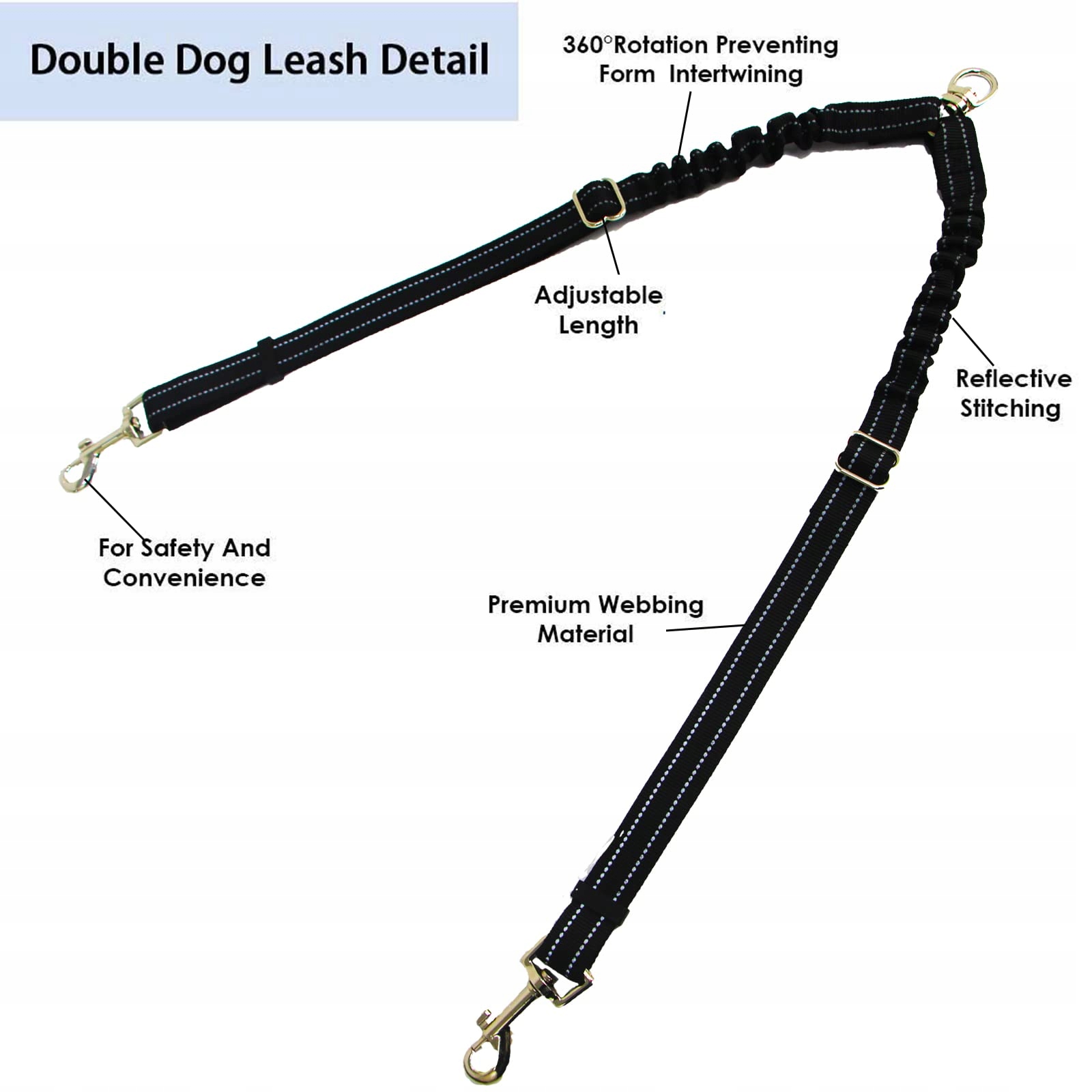 Bez plątania: Konstrukcja podwójnej smyczy z 360° obrotem zapewnia bezpieczeństwo bez plątania. Podczas spaceru z dwoma psami nie ma ograniczeń w ich ruchu w lewo i prawo, a oba psy nie przeszkadzają sobie nawzajem