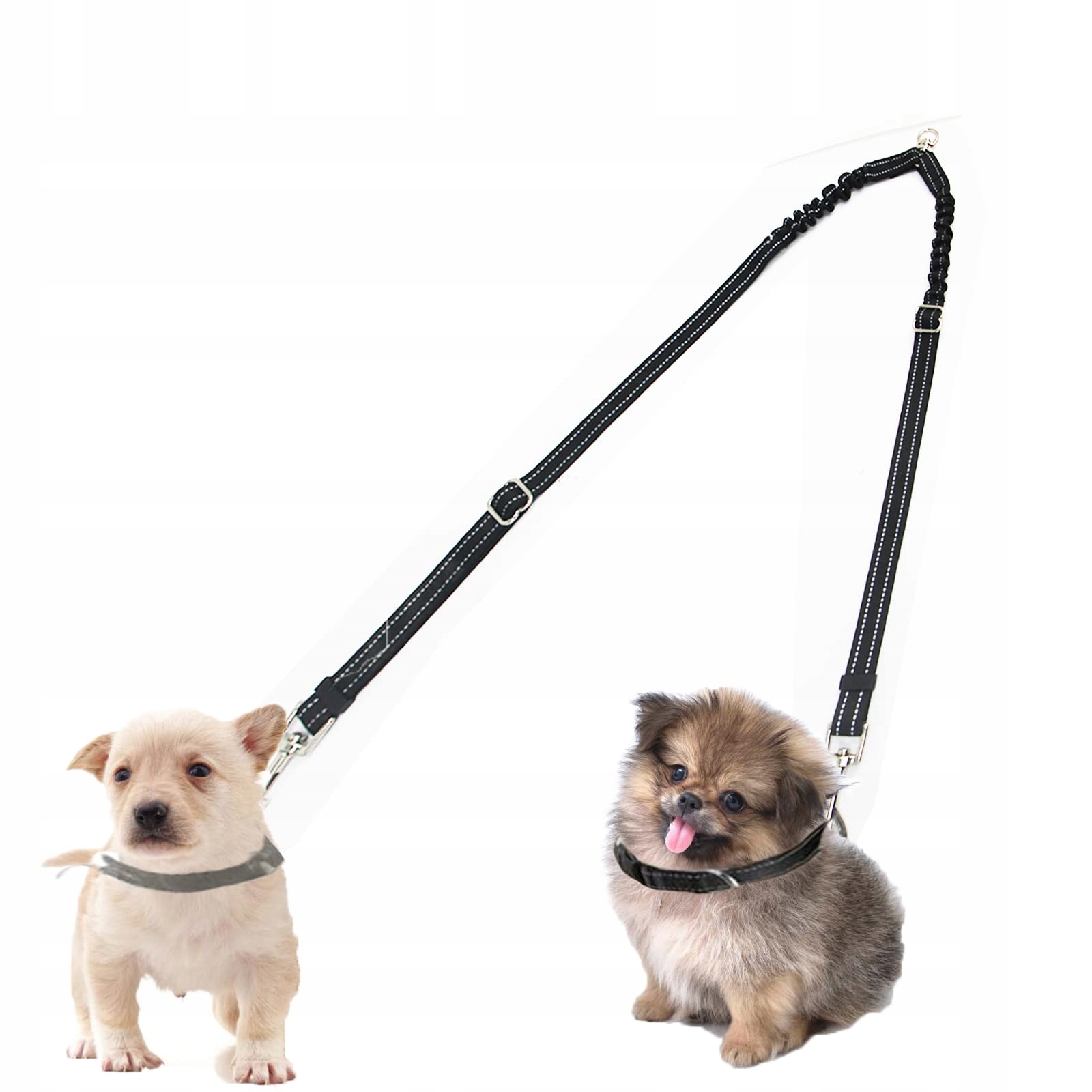 Regulowana smycz: Regulowana smycz dla 2 psów z funkcją amortyzacji, która redukuje skutki intensywnych ćwiczeń. Amortyzator smyczy może osiągnąć maksymalnie 60 centymetrów, co pozwala psom na swobodne poruszanie się