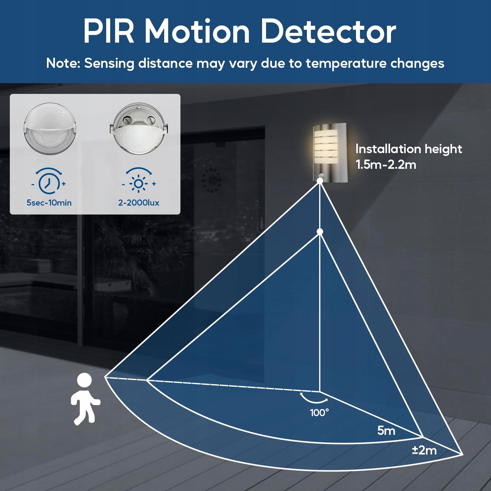 Kerry PIR zewnętrzna lampa ścienna, oświetlenie zewnętrzne na drzwi wejściowe, zasilane z sieci, wodoodporne IP44, lampa zewnętrzna, gięta stal nierdzewna z czujnikiem ruchu, lampa ścienna E27 na werandę