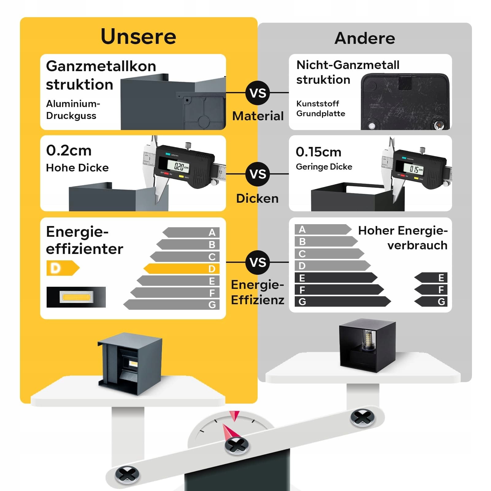 Wysoka jakość i odporność na warunki atmosferyczne: Kinkiety przeszły testy CE, ROHS i REACH. Te delikatne i eleganckie lampy zewnętrzne wykonane są z wysokiej jakości odlewanego aluminium z klasą odporności IP54 na warunki atmosferyczne i nie boją się deszczu, śniegu, burzy, owadów, korozji ani rdzy. Obudowa lampy jest zdejmowalna i łatwa do czyszczenia. Idealnie zaprojektowana do użytku na zewnątrz.