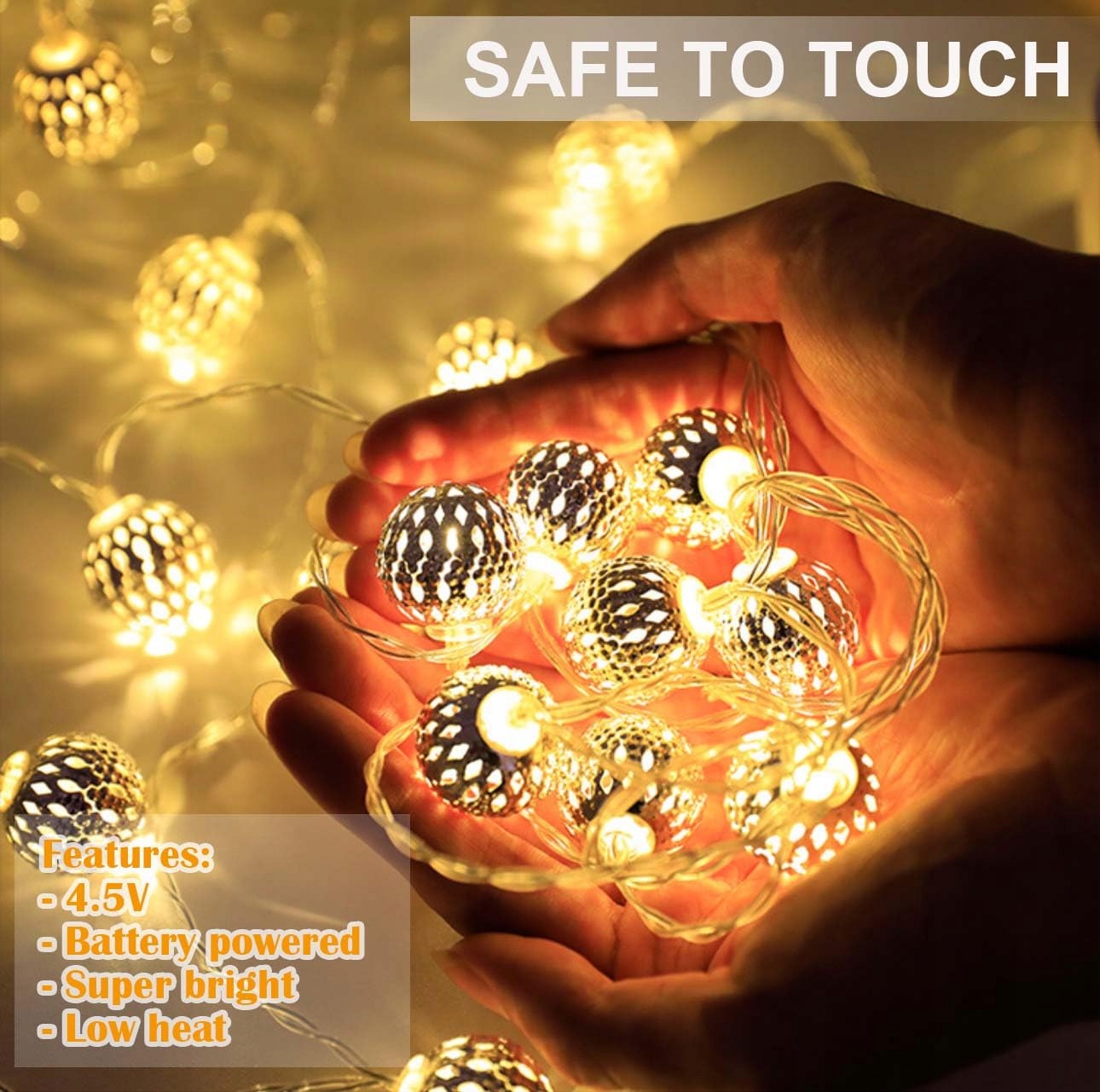 🌟 WYSOKIEJ JAKOŚCI MATERIAŁ: Girlanda świetlna wewnętrzna składa się z metalowych kul w kolorze srebrnym o średnicy 4 cm, stylowa i bardzo orientalna, łatwa do zawieszenia. Jednak nie trzymaj jej z dala od wilgotnych miejsc.