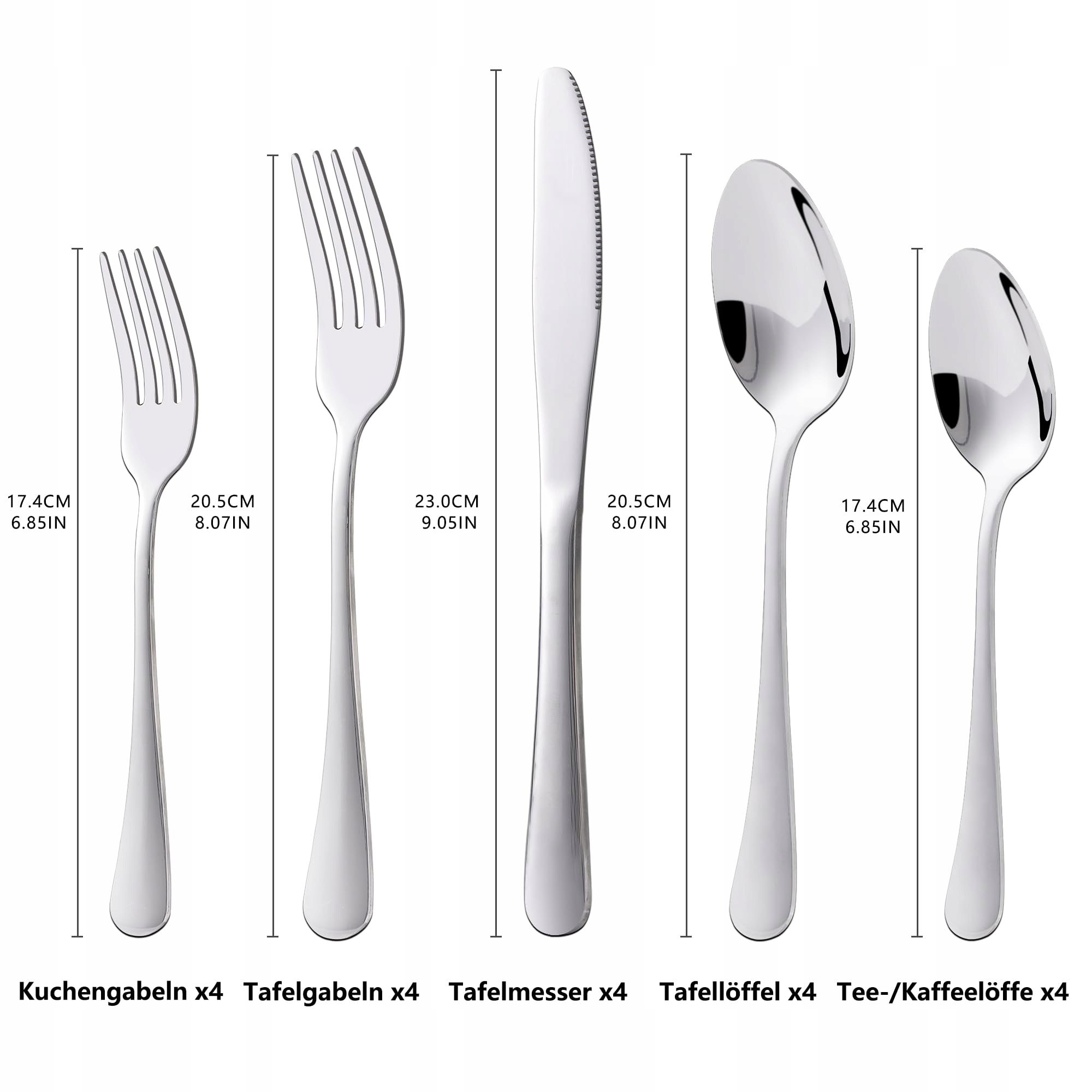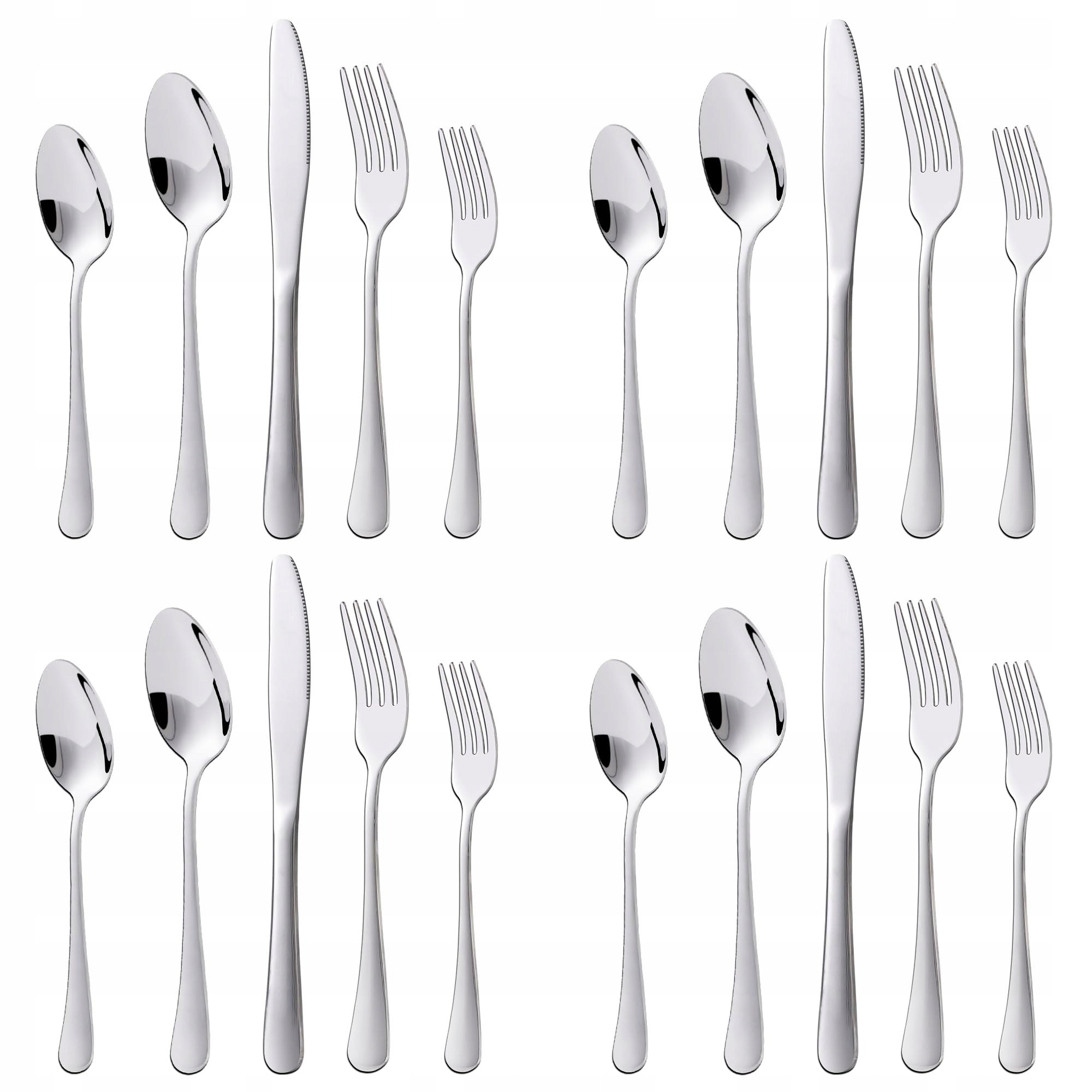 20-częściowy zestaw sztućców dla 4 osób: 4 noże, 4 łyżki, 4 widelce, 4 łyżeczki do deserów i 4 widelczyki do deserów.