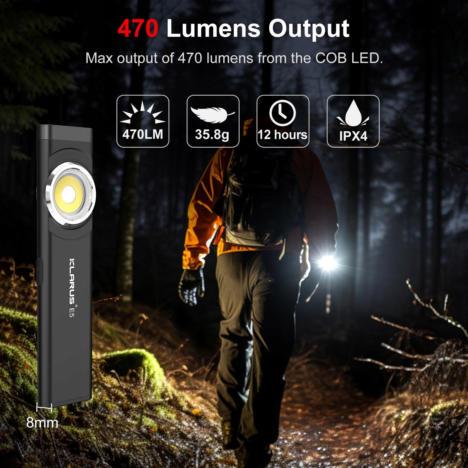 klarus E5 Ładowalna Mała Latarka, COB-Latarka robocza, 470 Lumenów, płaska mini latarka z magnetyczną podstawą i klipsem. Odpowiednia do konserwacji, biwakowania, wędrówek, sytuacji awaryjnych itp.