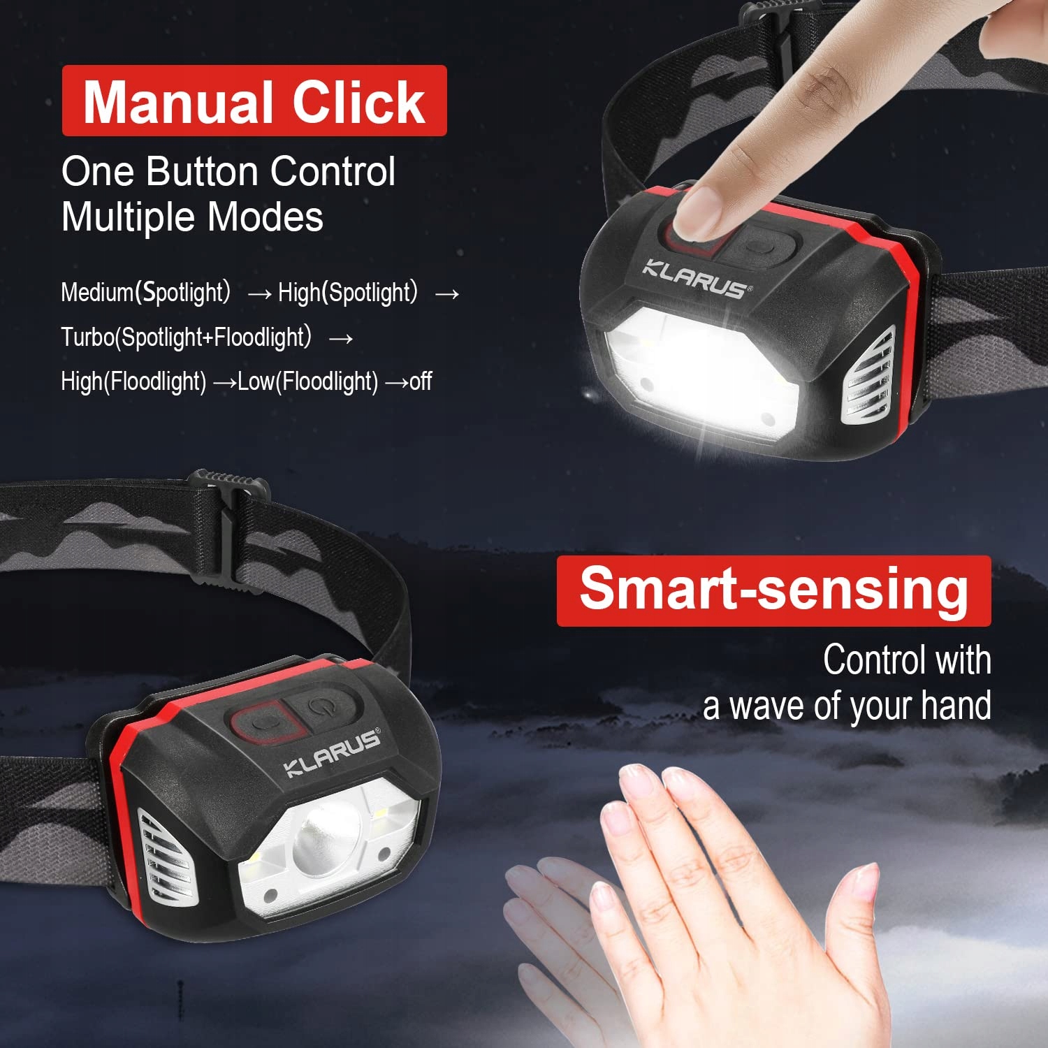 klarus HM1 440 Lumen ładowalna latarka czołowa z czujnikiem ruchu, 5 trybów, 70 godzin czasu pracy, wodoodporna latarka LED IPX6 do biegania, kempingu, wędrówek, polowania…
