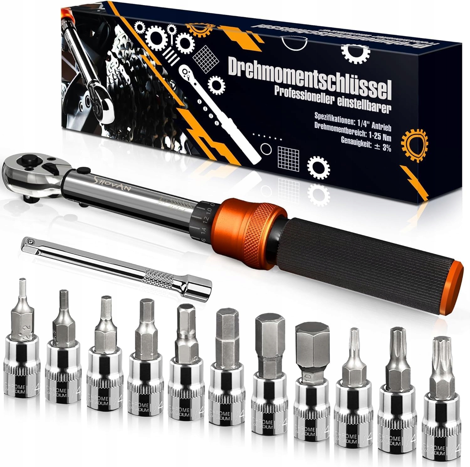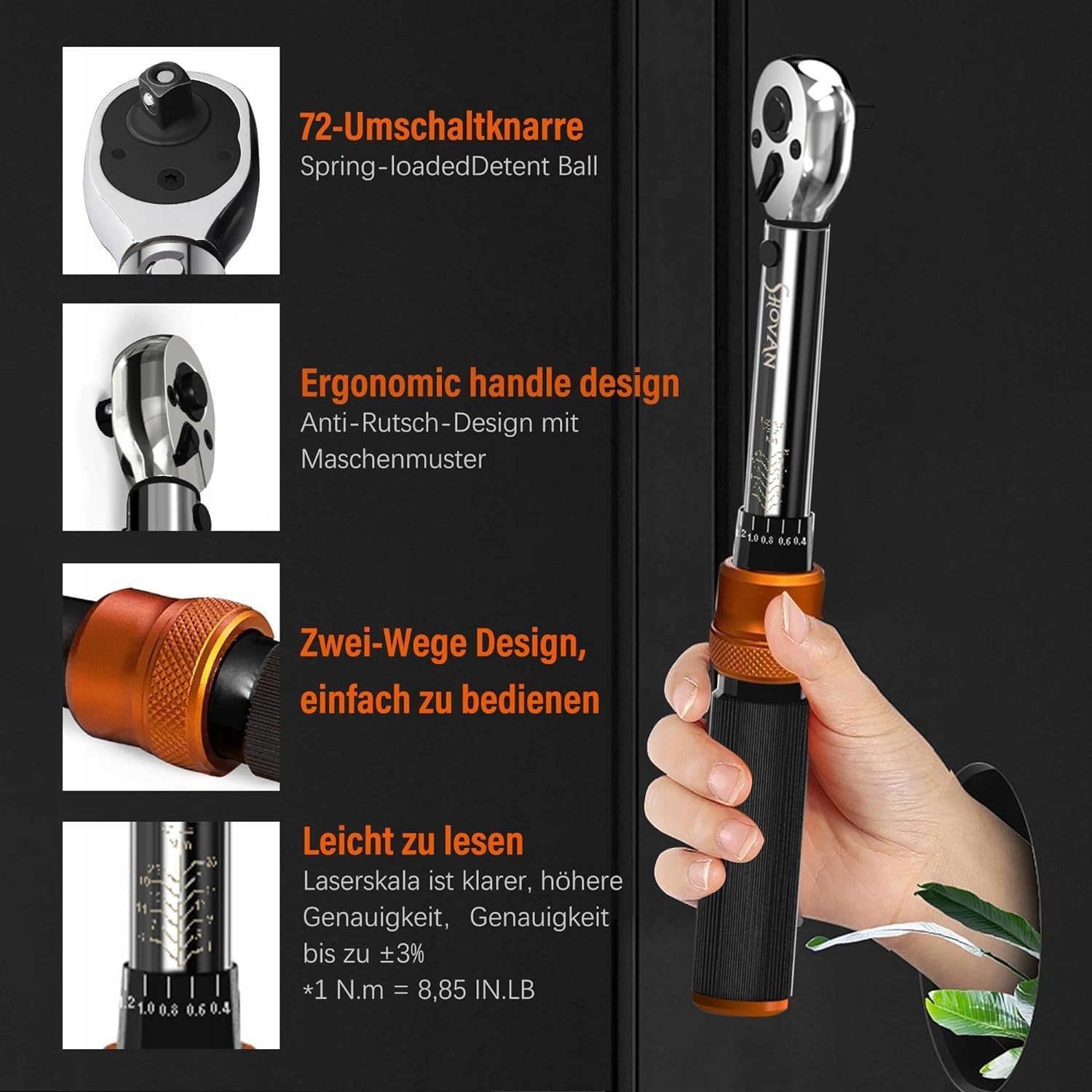 Łatwy w obsłudze - 72 przełączająca nasadka, w prawo w lewo dwukierunkowe ustawienie. Klucz dynamometryczny jest wyposażony w przycisk szybkiego zwolnienia, który umożliwia łatwe zakładanie i zdejmowanie nasadki. Ustawienie wartości momentu obrotowego - aby zablokować, nacisnąć, ustawić wartość momentu obrotowego, puścić, automatyczne zablokowanie wartości momentu obrotowego. Zakres regulacji 1-25Nm, najmniejszy krok 0,2Nm.