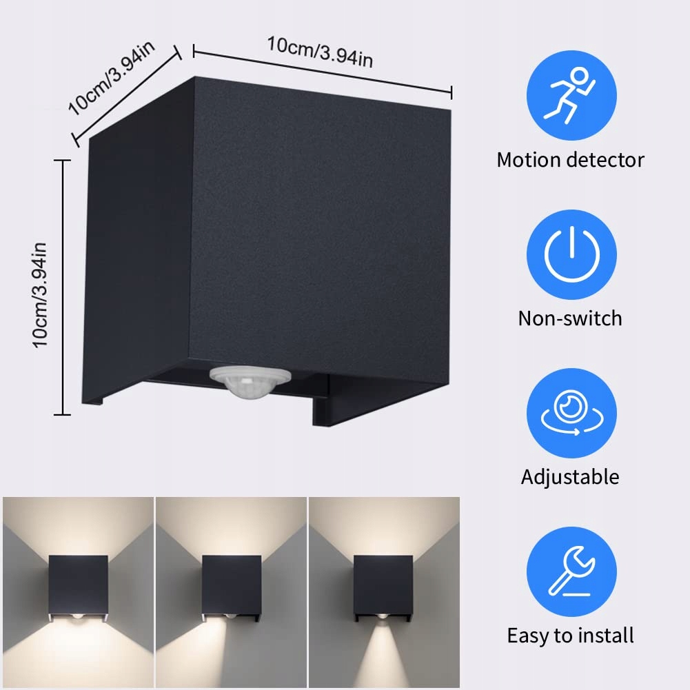 3.[Najwyższa jakość]Kinkiet LED z czujnikiem ruchu wykonany jest z wysokiej jakości odlewanego aluminium. Korpus lampy jest solidny i wykazuje doskonałą odporność na nacisk i korozję. Zewnętrzny kinkiet z czujnikiem ruchu ma nowoczesny design, prosty i hojny.