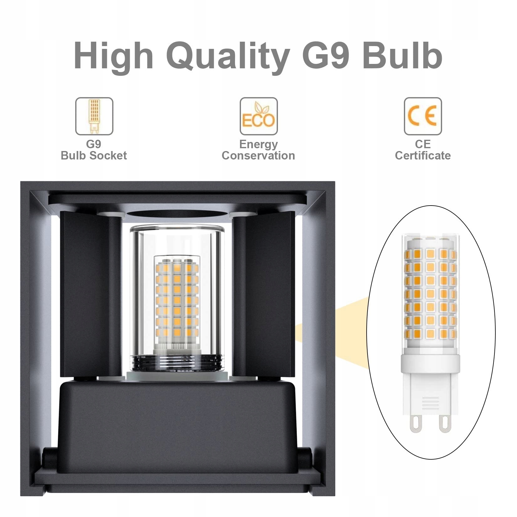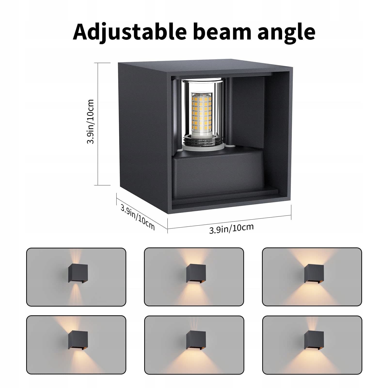 3.[Wymiary elementu] Korpus LED kinkietu: szerokość 100 mm x głębokość 100 mm x wysokość 100 mm. Typ żarówki: 9W G9 LED oświetla 650LM (może być wymieniona samodzielnie).