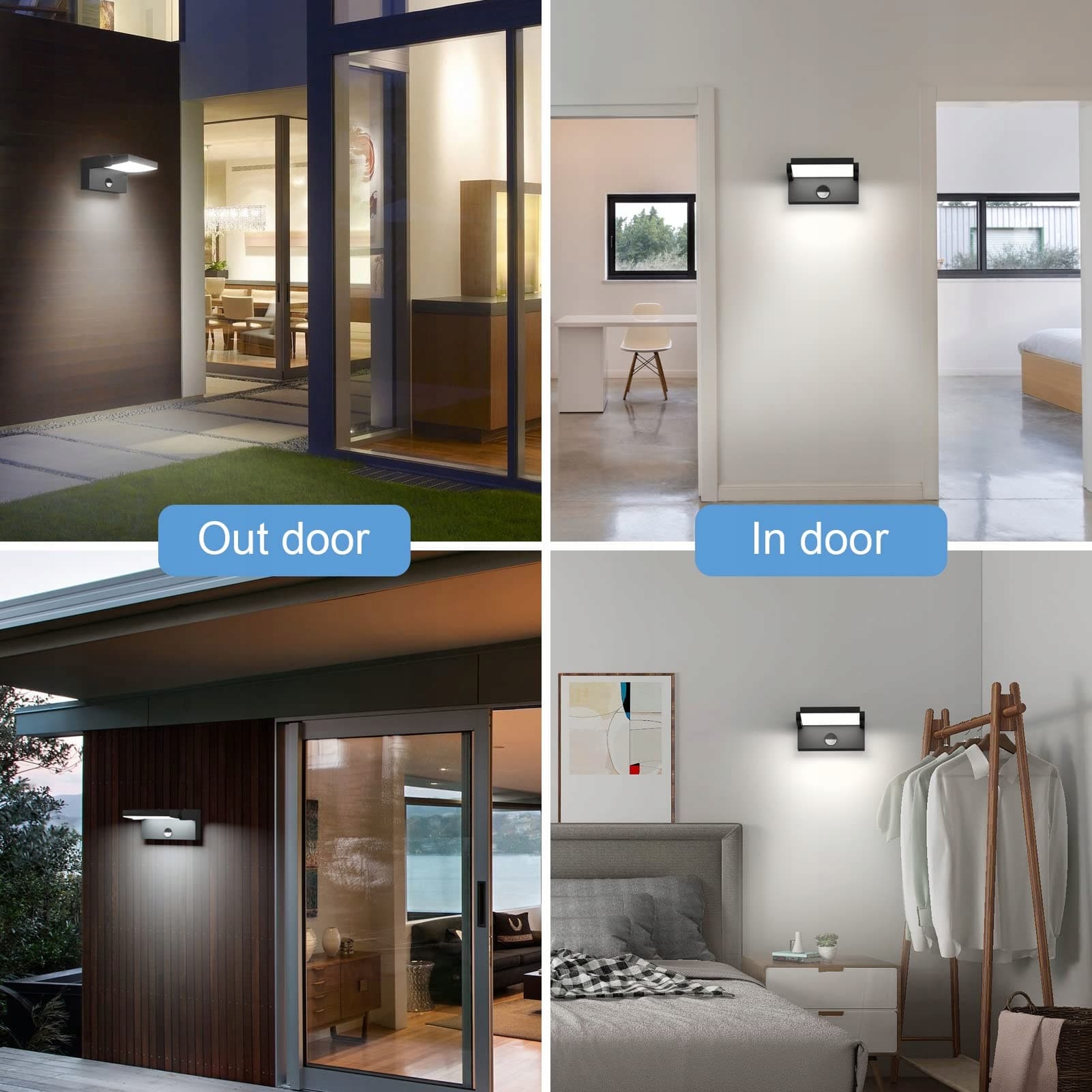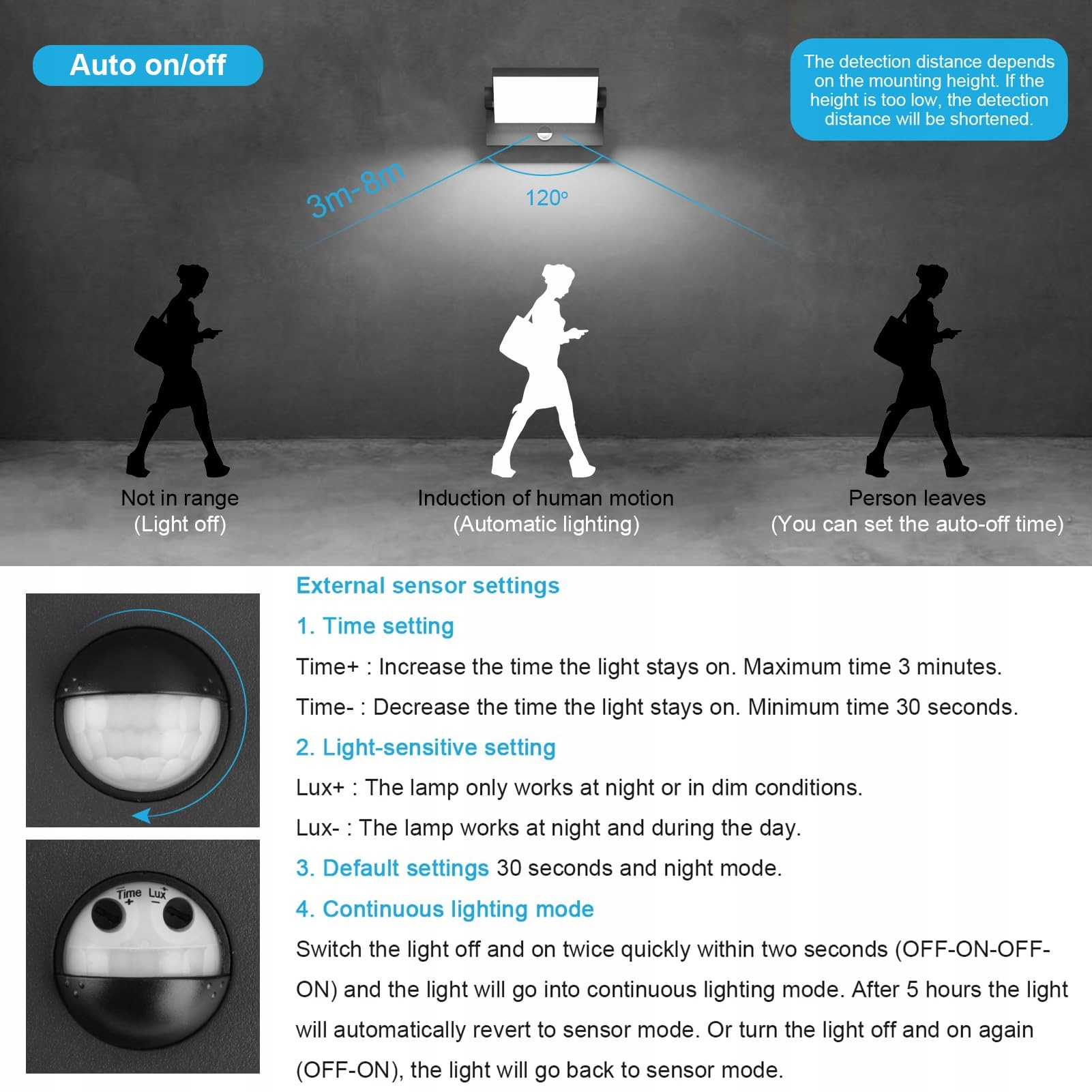 [Funkcja czujnika ruchu]1. Lampa zewnętrzna automatycznie włącza się w odległości 3m-8m. 2. Możesz ustawić czujnik tak, aby działał tylko w nocy, lub możesz go ustawić tak, aby działał zarówno w dzień, jak i w nocy. 3. Lampa ścienna automatycznie zapala się, gdy ktoś przechodzi obok. I automatycznie wyłącza się, gdy nie ma ruchu (możesz ustawić czas wyłączenia lampy ściennej od 30 sekund do 3 minut).