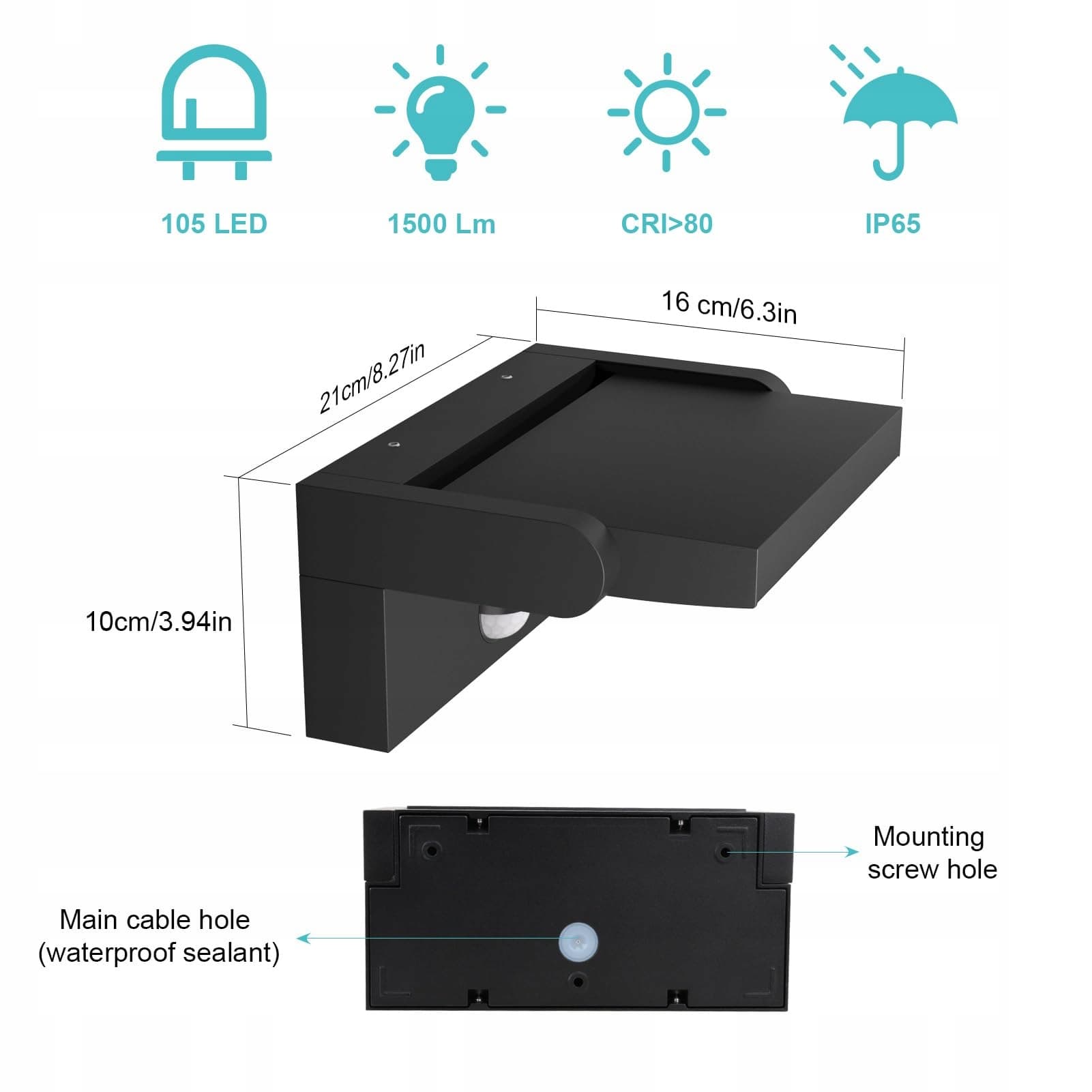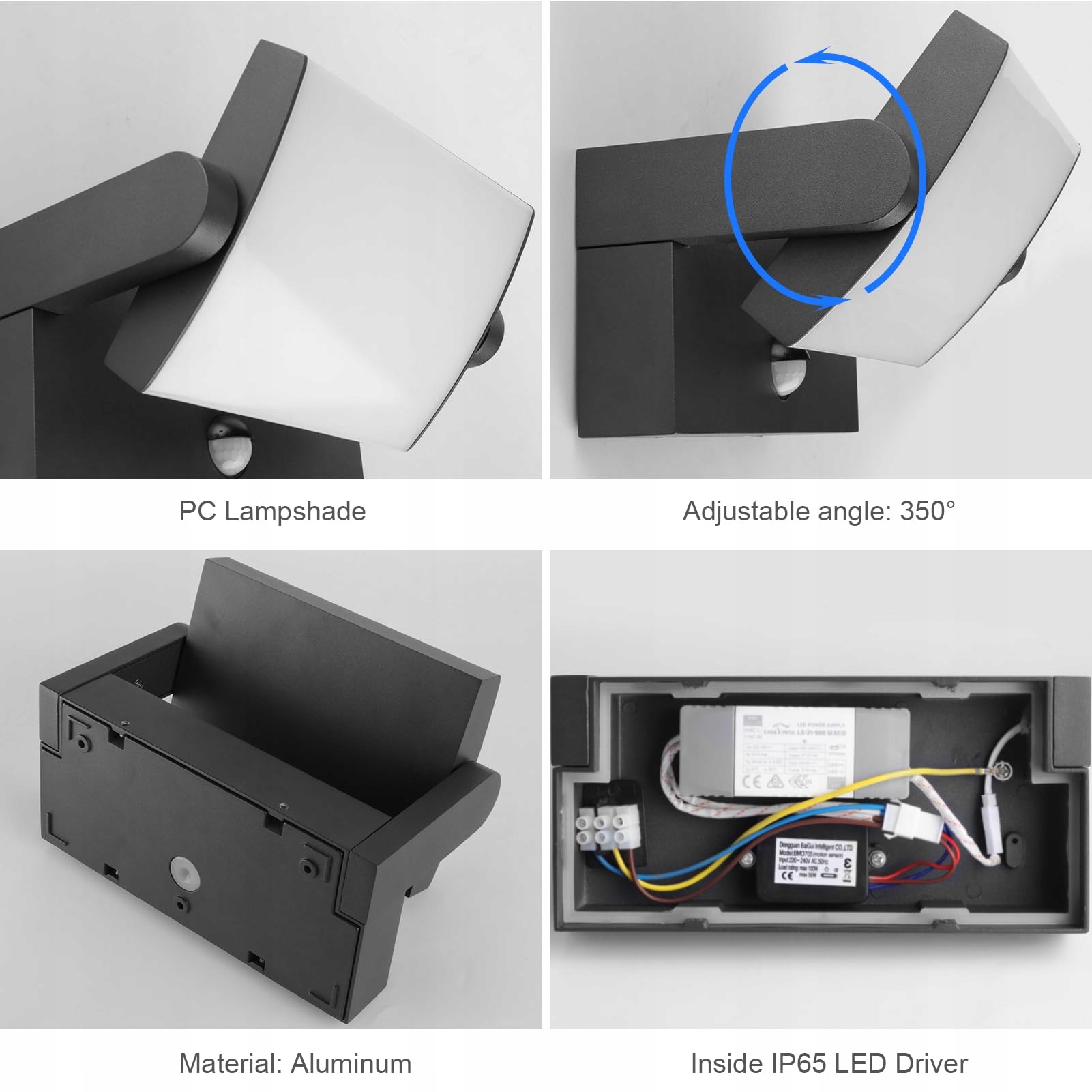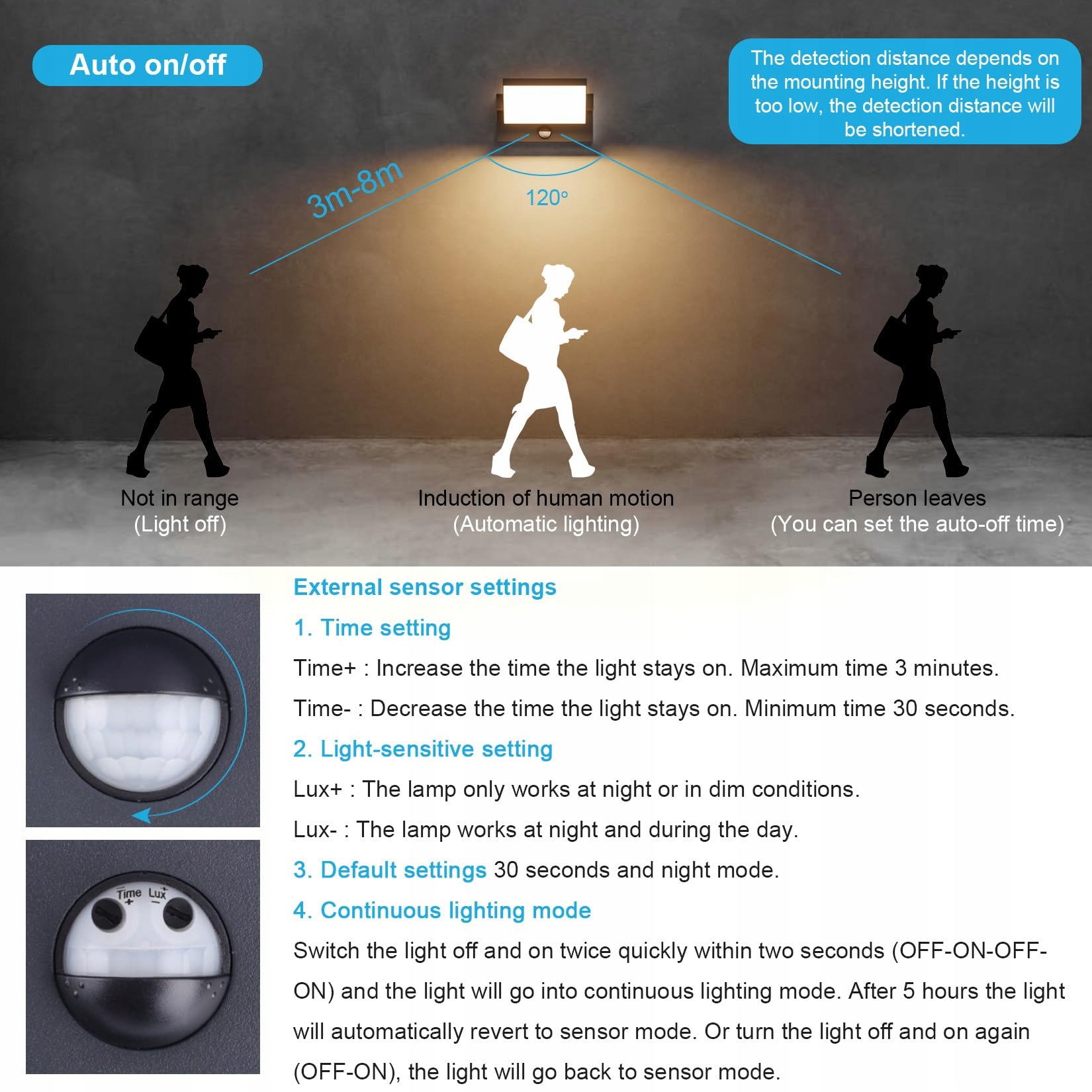 【Funkcja czujnika ruchu】1.Lampa zewnętrzna włącza się automatycznie w promieniu 3m-8m. 2.Możesz ustawić czujnik tak, aby działał tylko w nocy, lub możesz go ustawić tak, aby działał zarówno w dzień, jak i w nocy. 3.Lampa ścienna automatycznie się włącza, gdy ktoś przechodzi obok. I wyłącza się automatycznie, gdy nie ma ruchu (możesz ustawić czas wyłączenia lampy ściennej od 30 sekund do 3 minut). 4.Czujnik można dezaktywować.