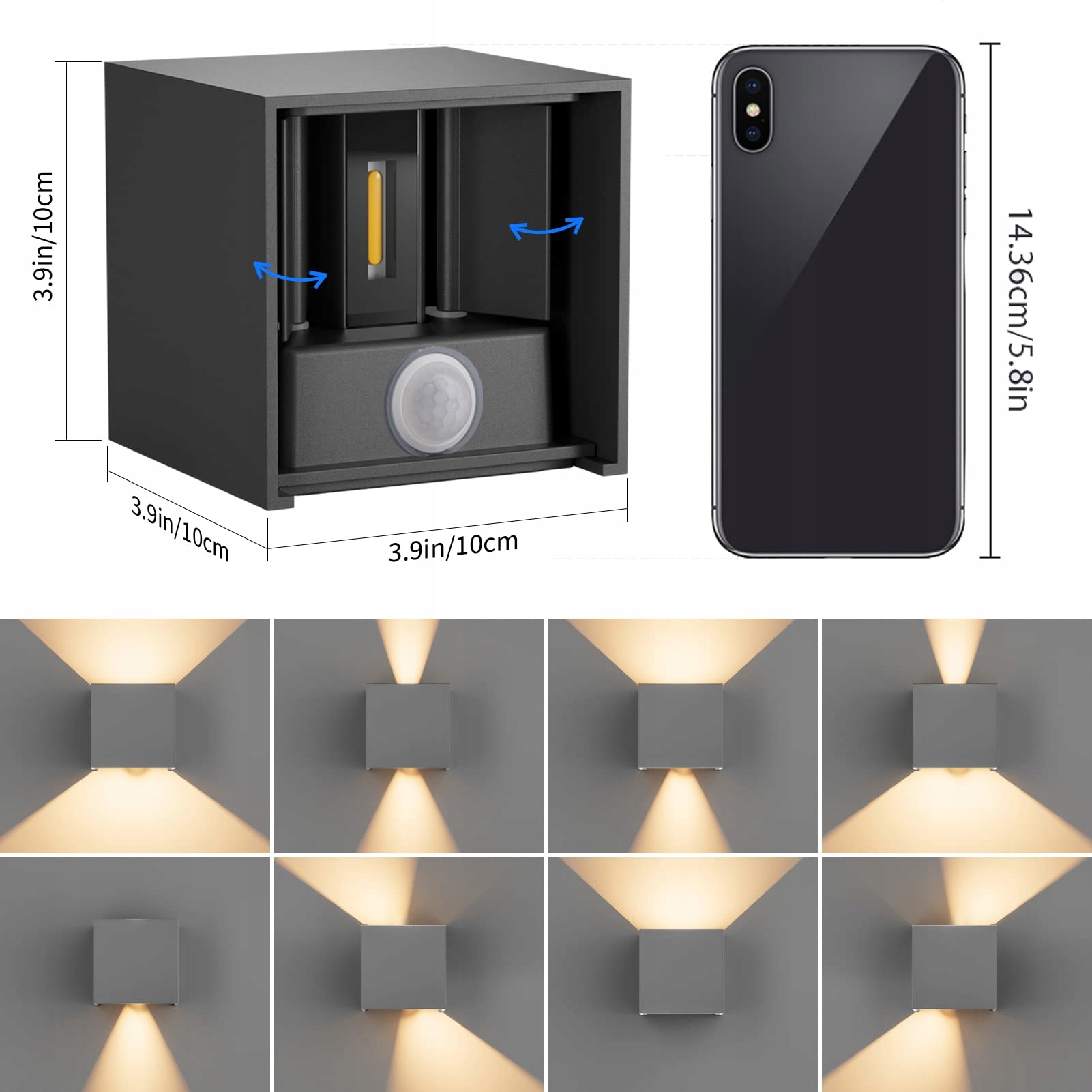 3.【Wysoka jakość】Lampa ścienna LED z czujnikiem ruchu wykonana jest z wysokiej jakości odlewu aluminiowego. Korpus lampy jest solidny i cechuje się doskonałą odpornością na nacisk i korozję. Lampa ścienna z czujnikiem ruchu ma nowoczesny design, prosty i elegancki.