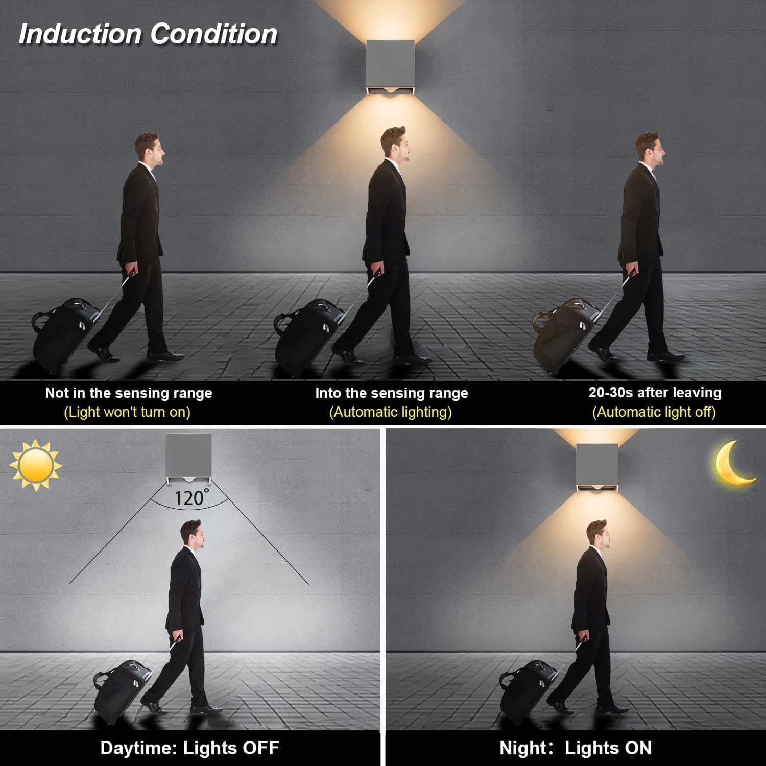 2.【Regulowany kąt świecenia】Lampa ścienna z czujnikiem ruchu pozwala na regulację kąta świecenia (0°-120°), aby tworzyć różne efekty świetlne. Zapewnia piękne efekty świetlne i różnorodne dobre atmosfery do oświetlenia lub dekoracji.