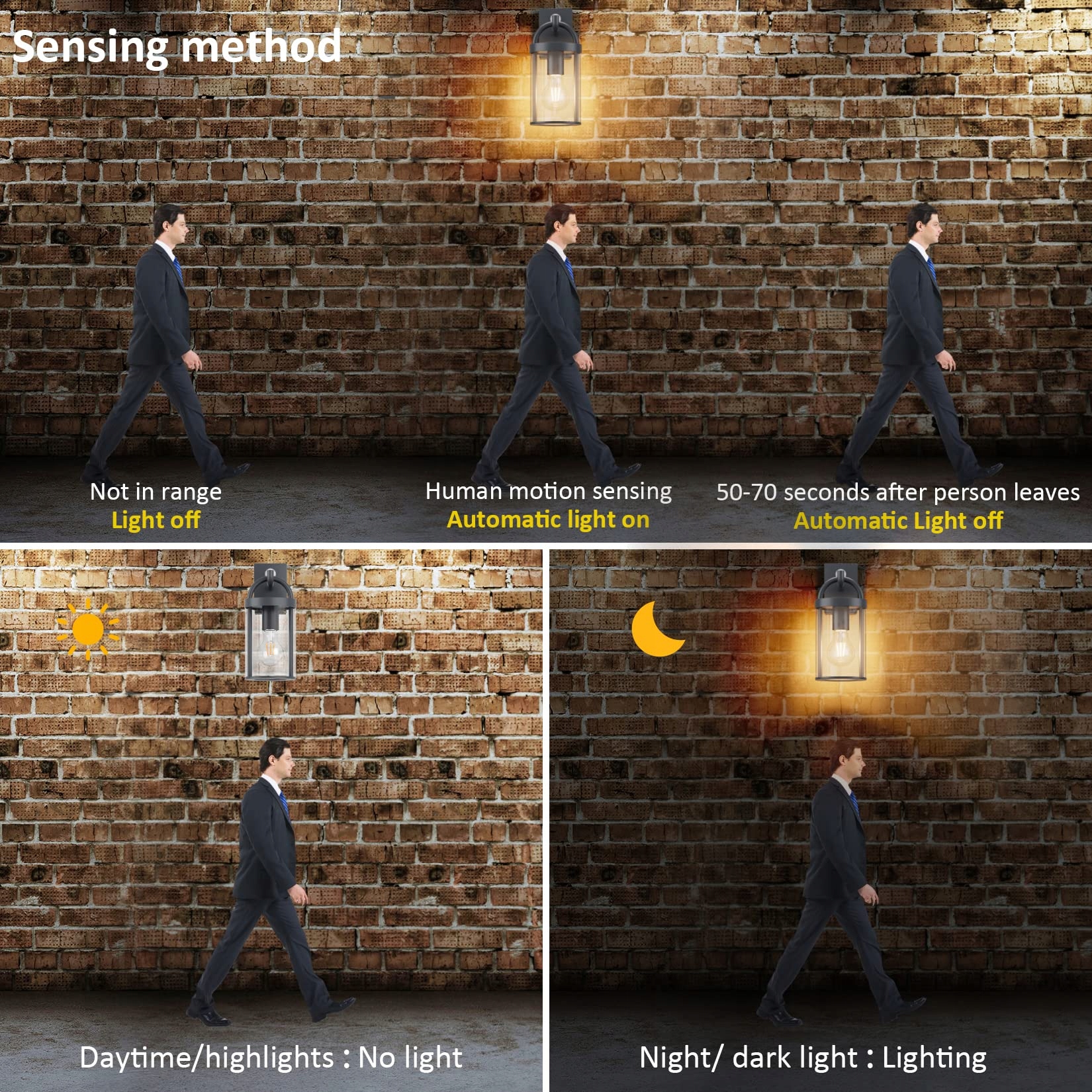 【Funkcja czujnika ruchu】: Retro lampa ścienna z czujnikiem ruchu, wbudowanym czujnikiem ruchu i ludzkim czujnikiem podczerwieni. W nocy światło włącza się, gdy ktoś wejdzie w obszar wykrywania. Gdy nie wykryje ruchu ludzkiego, automatycznie się wyłącza. W ciągu dnia lampa ścienna automatycznie się wyłącza, co czyni ją bardziej energooszczędną, wygodną i przyjazną dla środowiska. Nie ściemnialna.