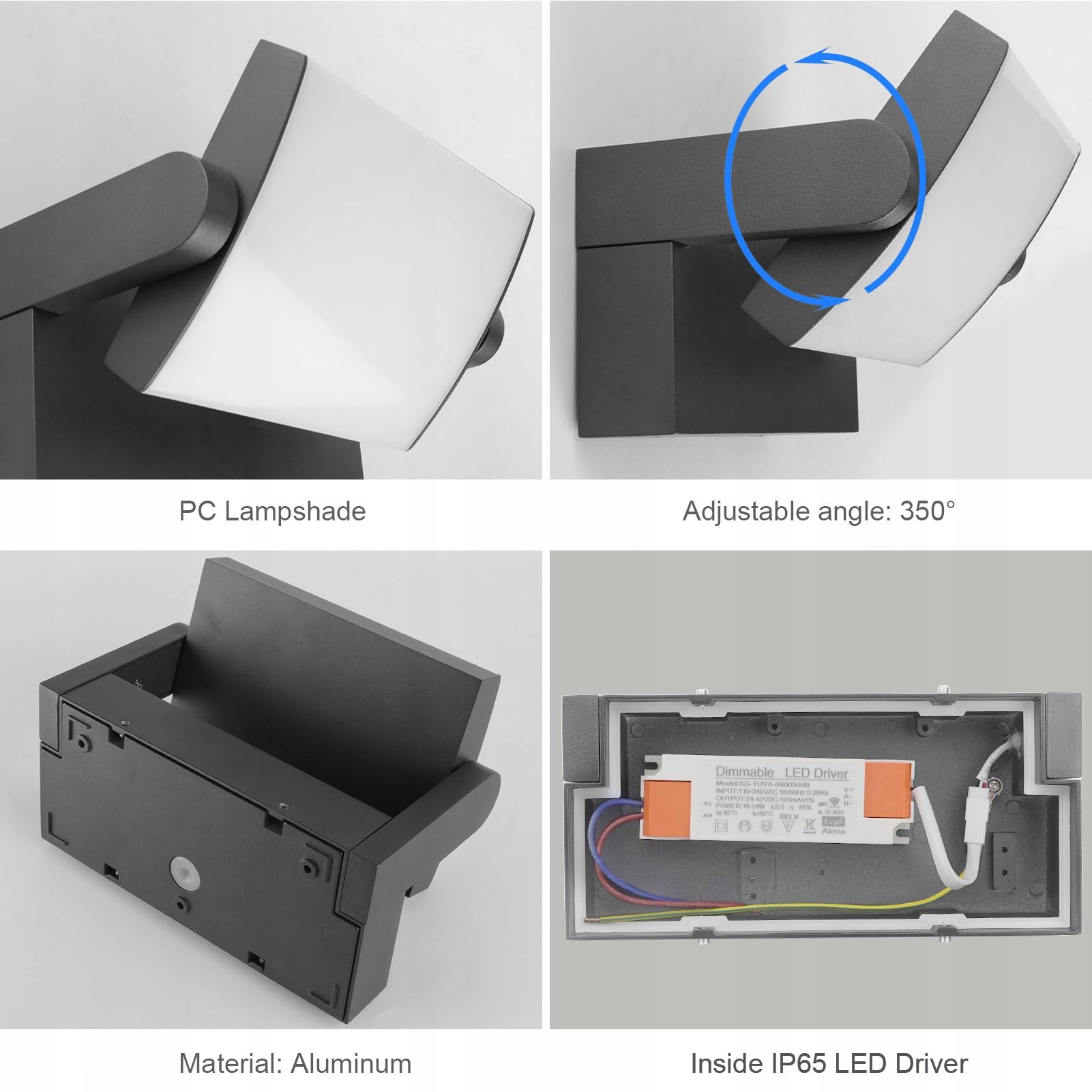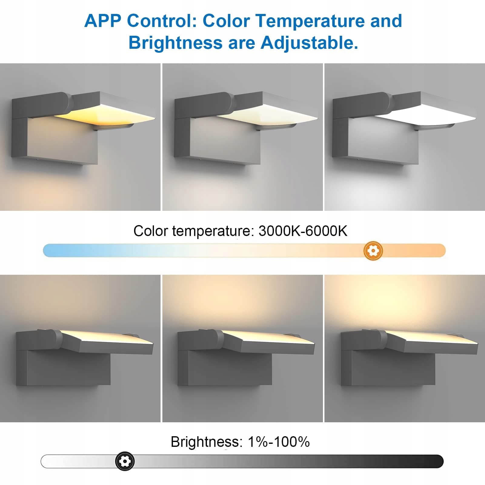 Klighten 24W Zewnętrzna lampa ścienna ściemnialna z kontrolą przez aplikację, timer, obrotowy panel LED, lampa ścienna wewnętrzna zewnętrzna, wodoodporna IP65 lampa ścienna do ogrodu korytarza, ciemnoszara, 1500 LM, 3000K-6000K