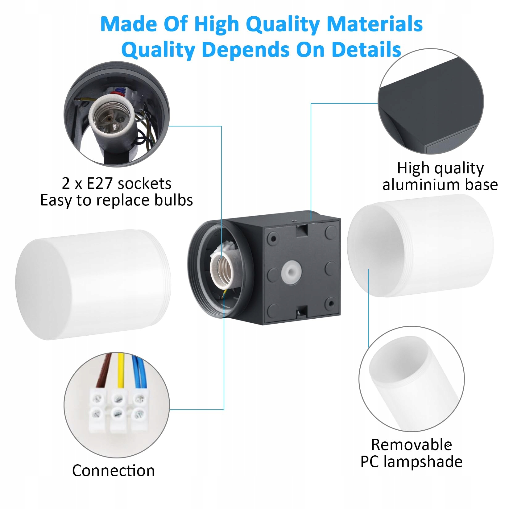 【Oprawka E27】:Kinkiet zewnętrzny na żarówki E27, max 40W (rozmiar żarówki 10,5cm*6cm), składa się z dwóch żarówek (żarówki nie są dołączone), wybierz swój ulubiony kolor światła i spraw, aby Twój dom rozbłysnął pięknym światłem.