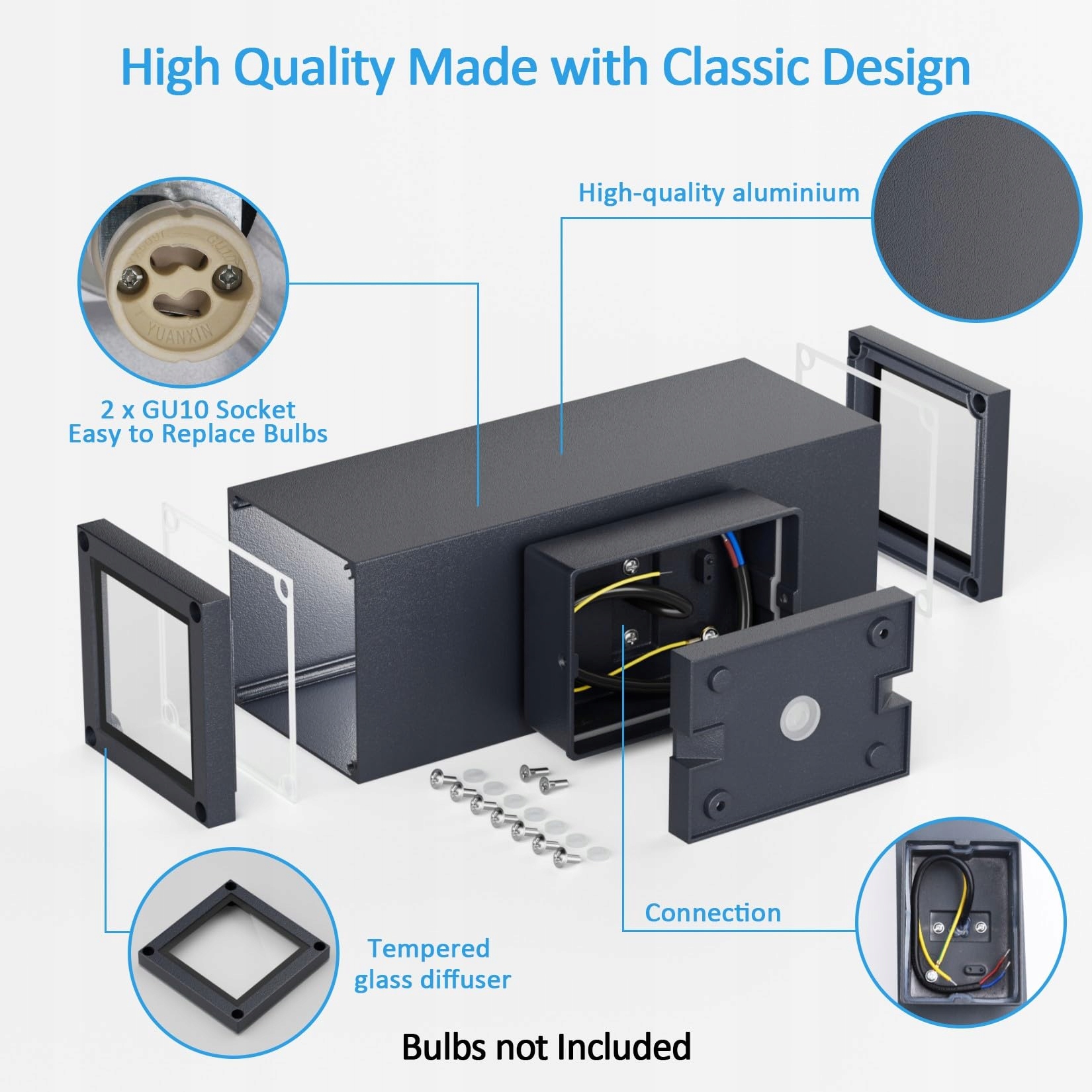 【Oprawka GU10】Kinkiety ścienne na zewnątrz nadają się do każdej lampy z oprawką GU10 (maks. 60W), pokazane źródło światła nie jest dołączone do zestawu. Wybierz własny kolor światła i pozwól, aby Twój dom rozbłysnął pięknym światłem.