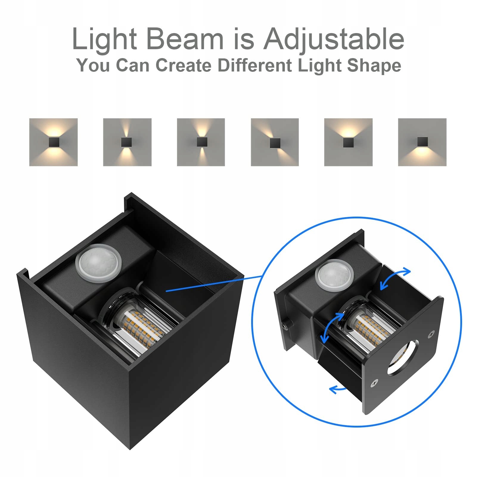 2.【Regulowany kąt świecenia】Lampa zewnętrzna z czujnikiem ruchu ma prosty i estetyczny design z wbudowanymi osłonami górną i dolną. Możesz ustawić różne kąty światła w tej samej scenie, regulując osłonę akustyczną.