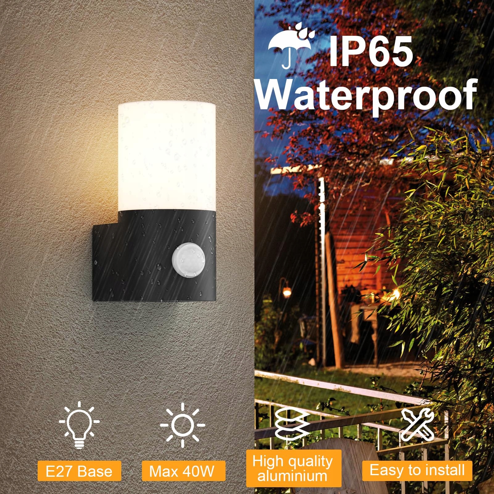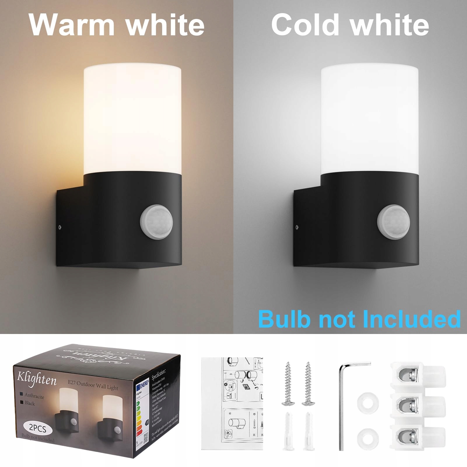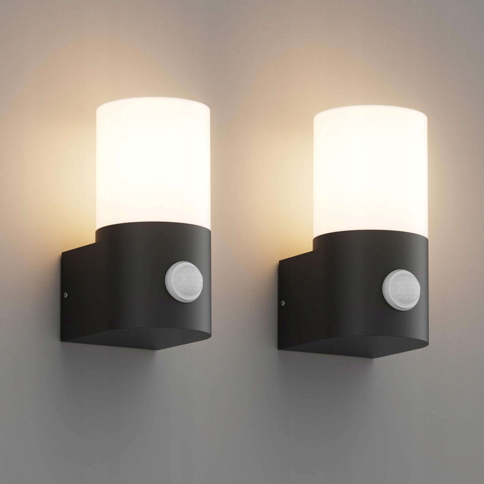 Klighten 2 sztuki kinkietów zewnętrznych/wewnętrznych E27 oprawka kinkiet zewnętrzny, lampa zewnętrzna z czujnikiem ruchu, IP65 lampa zewnętrzna, lampa zewnętrzna do wejścia na taras, PC+aluminium, bez źródła światła, czarna