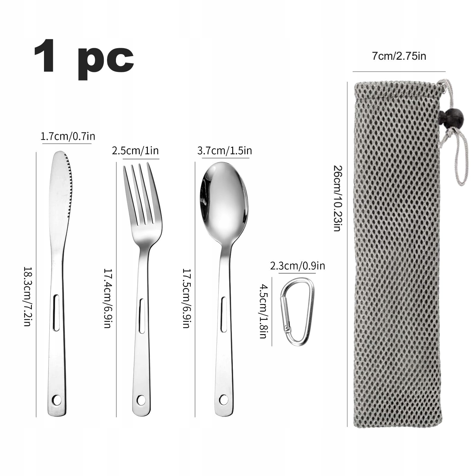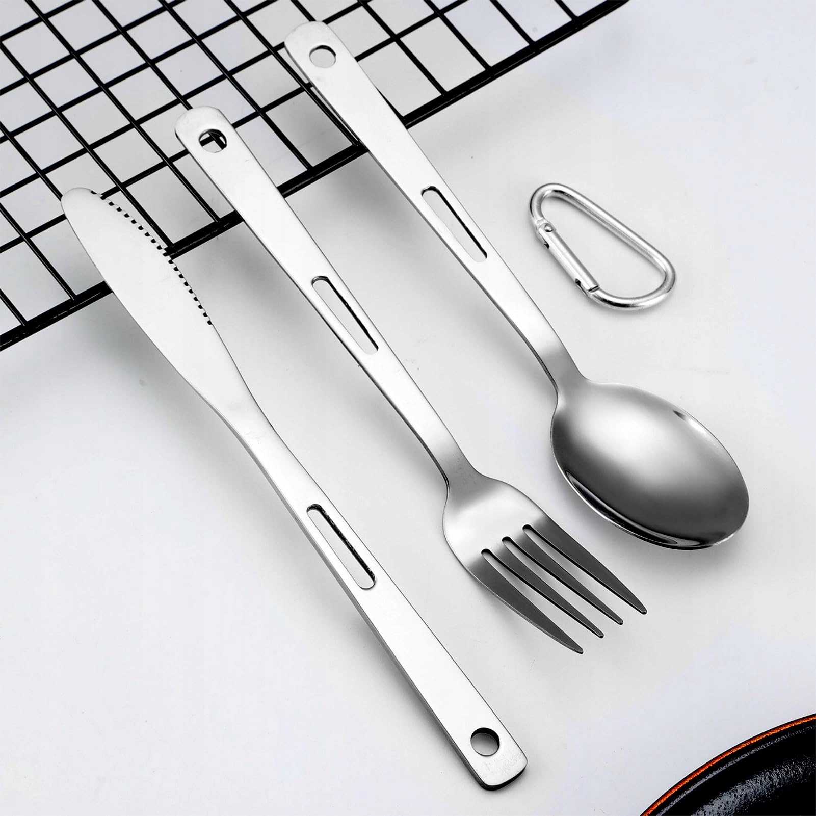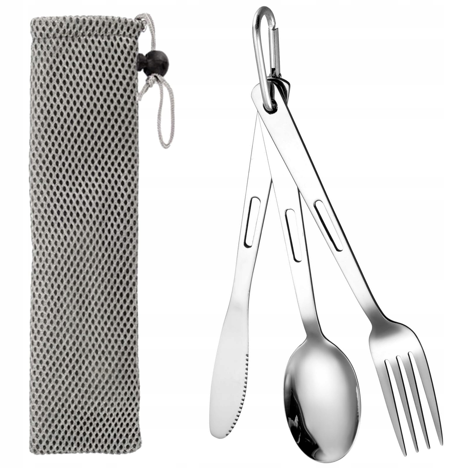 Zestaw sztućców ze stali nierdzewnej zawiera 1 widelec, 1 nóż, 1 łyżkę, 1 karabińczyk, 1 etui na przechowywanie, łącznie 5 sztuk. Może być wielokrotnie używany, aby spełnić Twoje codzienne potrzeby.