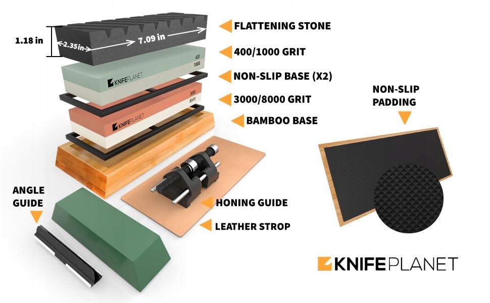 bezpieczne, bez wypadków, twoje bezpieczeństwo podczas ostrzenia noży jest najważniejsze. dlatego w każdym zestawie ostrzałek mamy 2 antypoślizgowe gumowe podstawy i bambusowy uchwyt na kamień. zminimalizuj ryzyko niebezpiecznych poślizgów z knifeplanet!