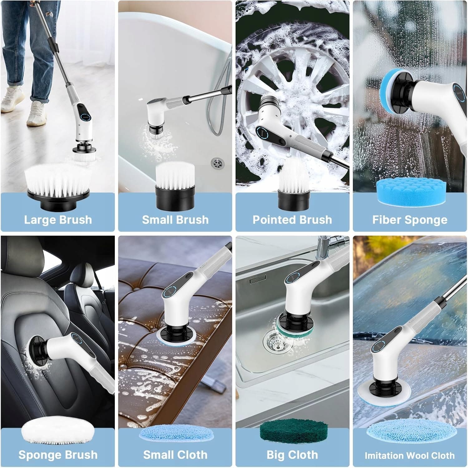8 w 1 głowica wielofunkcyjna - Elektryczna szczotka do czyszczenia do użytku domowego zawiera 8 wymiennych końcówek szczotkowych, które idealnie nadają się do czyszczenia płytek, łazienek, wanien, okien, podłóg i wielu innych powierzchni. Potężny silnik o wysokich obrotach szybko usuwa uporczywy brud, oszczędzając czas i wysiłek w porównaniu do ręcznego czyszczenia