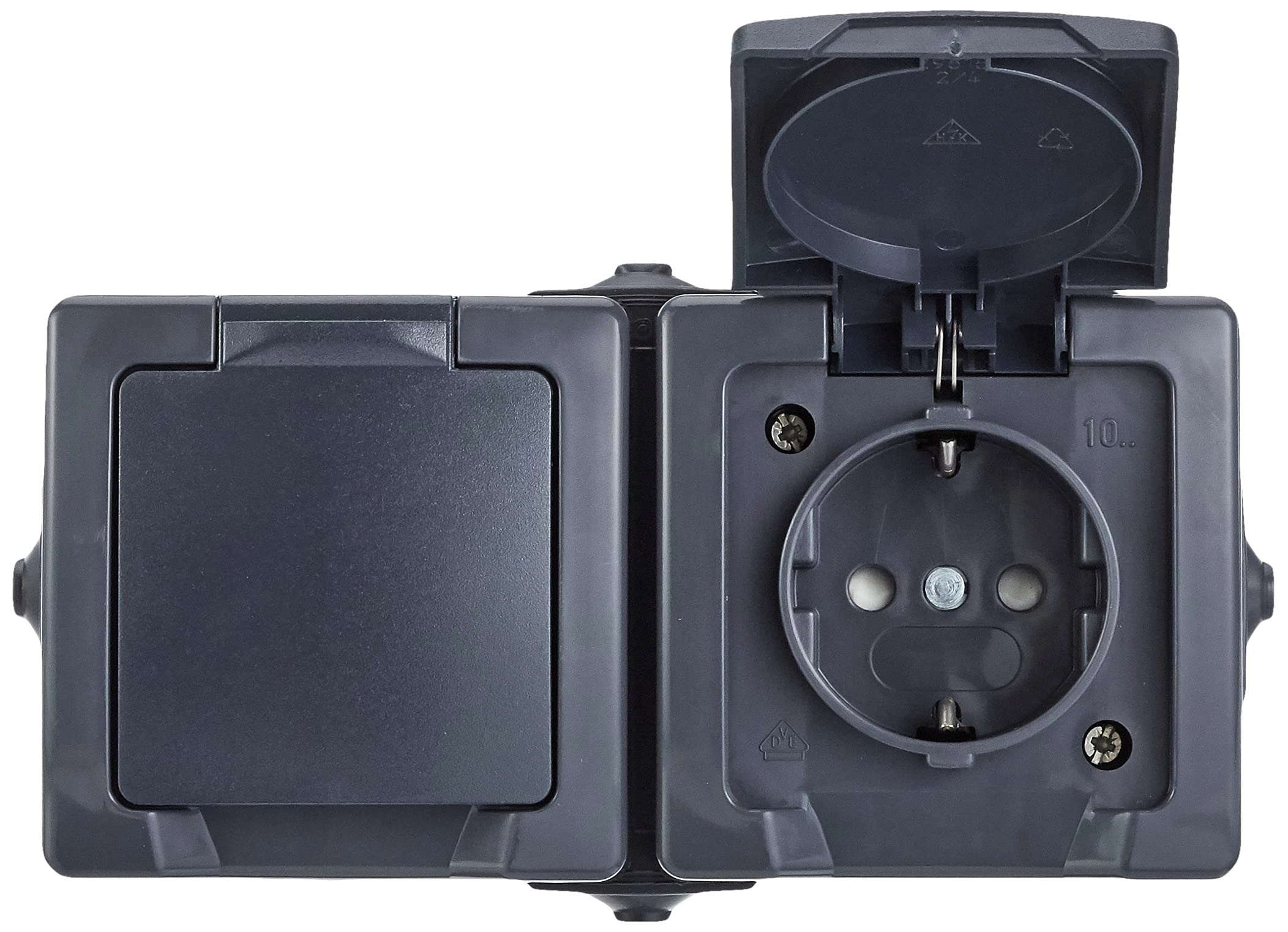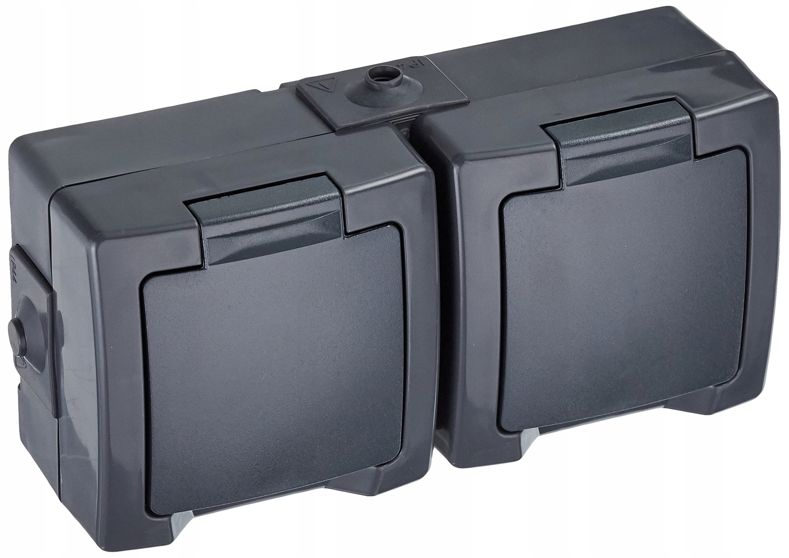 2-krotne gniazdo montażowe 16A, 250V/AC, poziome z klapką i zwiększoną ochroną przed dotykiem - idealne do piwnicy, pralni, garażu i warsztatu