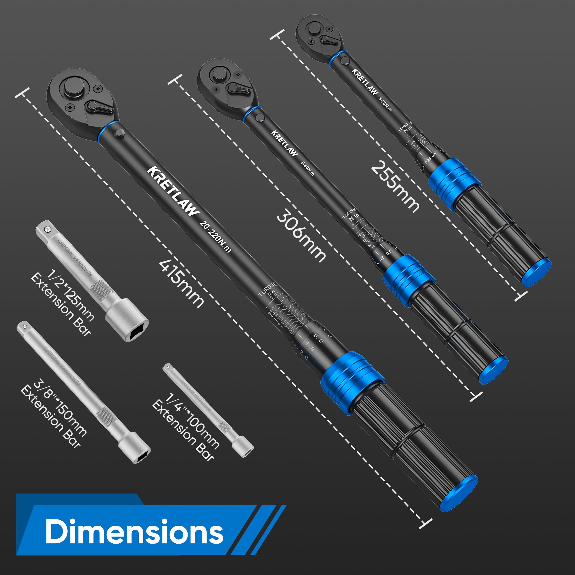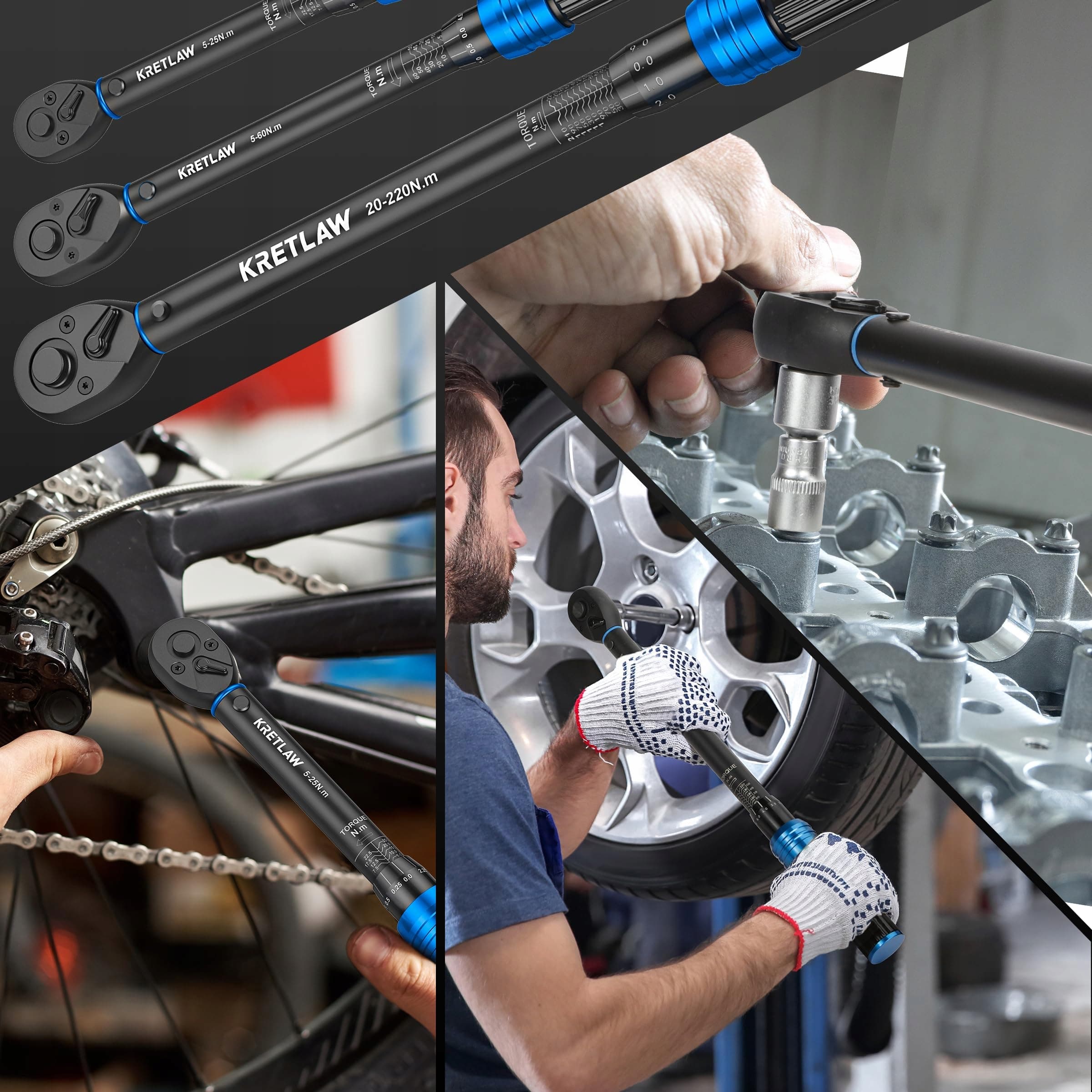 KRETLAW klucz dynamometryczny 1/2' & 3/8' & 1/4', 6-częściowy zestaw z grzechotką, 20-220Nm, 5-60Nm, 5-25Nm klucz dynamometryczny z ±3% 72-zębową głowicą grzechotki, 3 przedłużki do roweru, motocykla