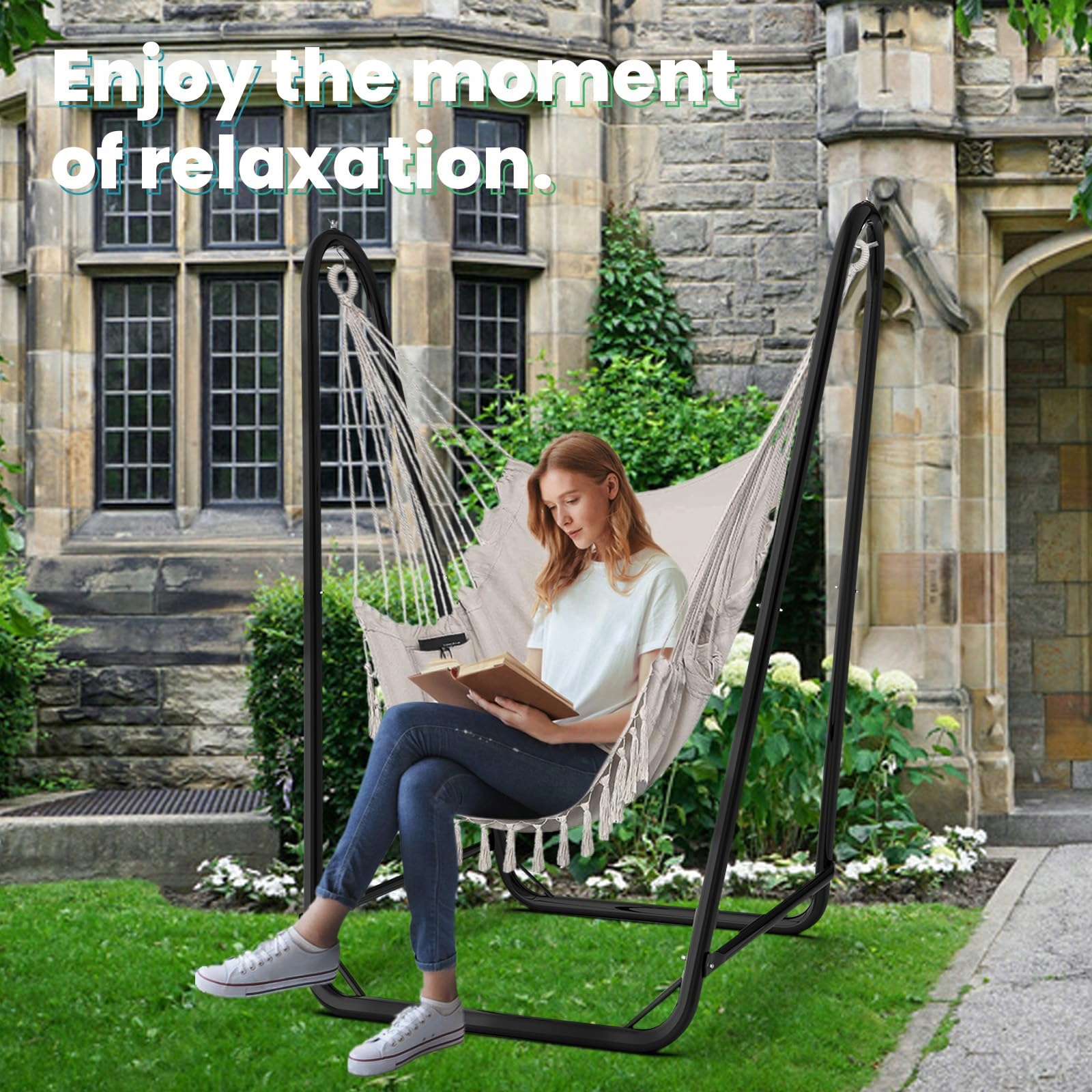 [Łatwa instalacja] Fotel wiszący z ramą można zainstalować za pomocą dołączonych narzędzi w zaledwie 10 minut. Odpowiedni rozmiar pozwala cieszyć się stojakiem na hamak w dowolnym miejscu i czasie.