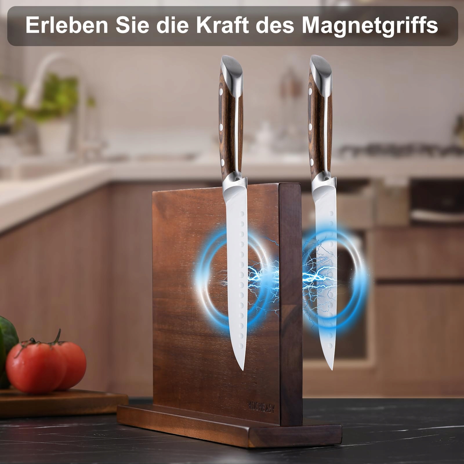MOCNY MAGNES: Ultranaciskające magnesy trwałe w naszym drewnianym bloku na noże bez noży przyciągają metalowy czubek twojego noża kuchennego podczas wkładania, co ułatwia, przyspiesza i zabezpiecza przechowywanie twoich noży. Utrzymuj całą kolekcję noży zorganizowaną i łatwo dostępną.