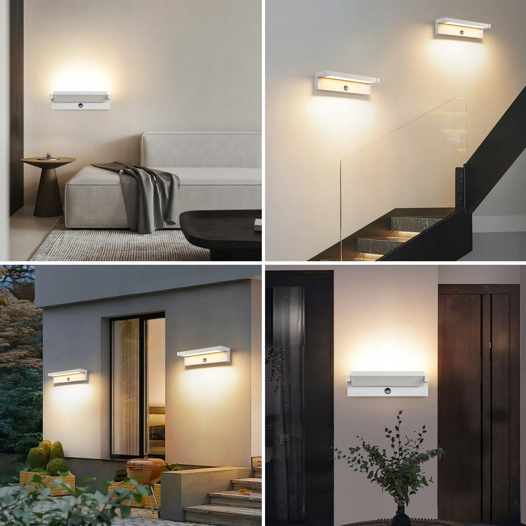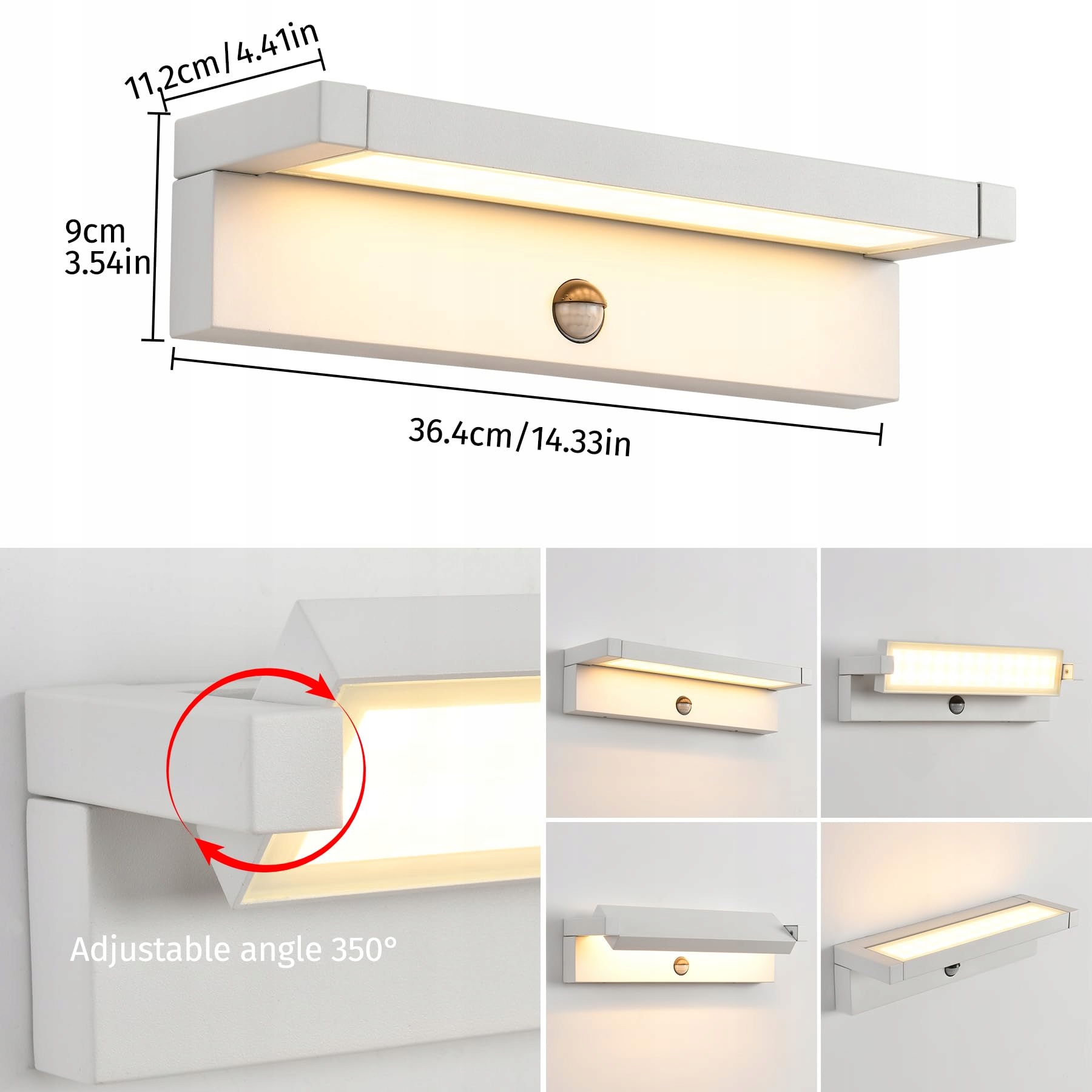 [Obrotowy panel LED] Panel LED zewnętrznej lampy ściennej z czujnikiem ruchu można obracać pionowo o 350°. Możesz dostosować zewnętrzną lampę ścienną w górę i w dół lub do przodu i do tyłu w zależności od potrzeb, lampa ścienna zapewnia piękne efekty świetlne do oświetlenia lub dekoracji.
