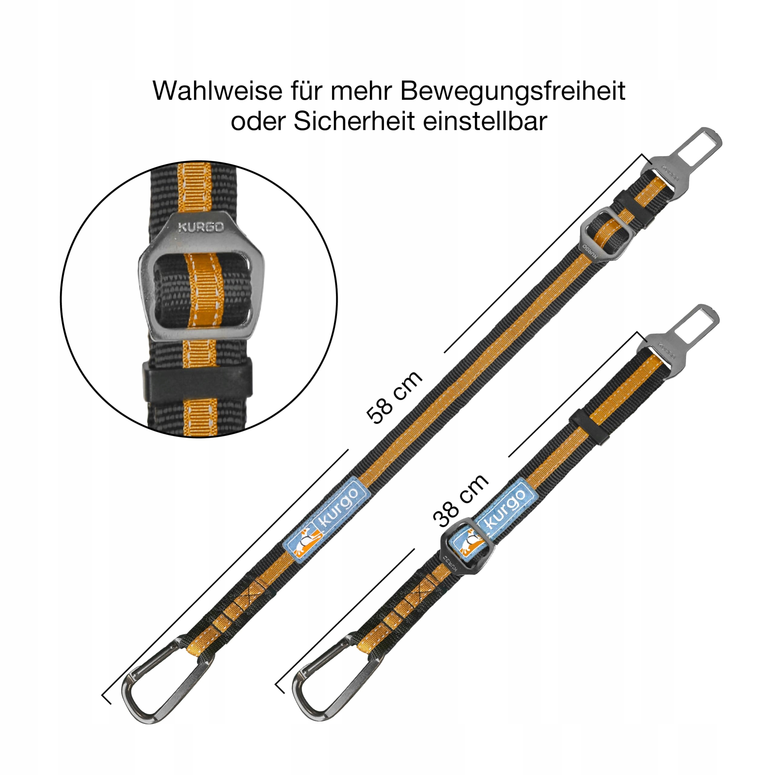 KOMPOZYCJA SMYCZY Z KARABINKIEM: Taśma mocująca jest przymocowana do uprzęży psa za pomocą karabinka (działa z każdą uprzężą dla psa, jednak zalecamy oddzielnie dostępną uprząż Kurgo Tru-Fit Crash-Tested Dog Harness)