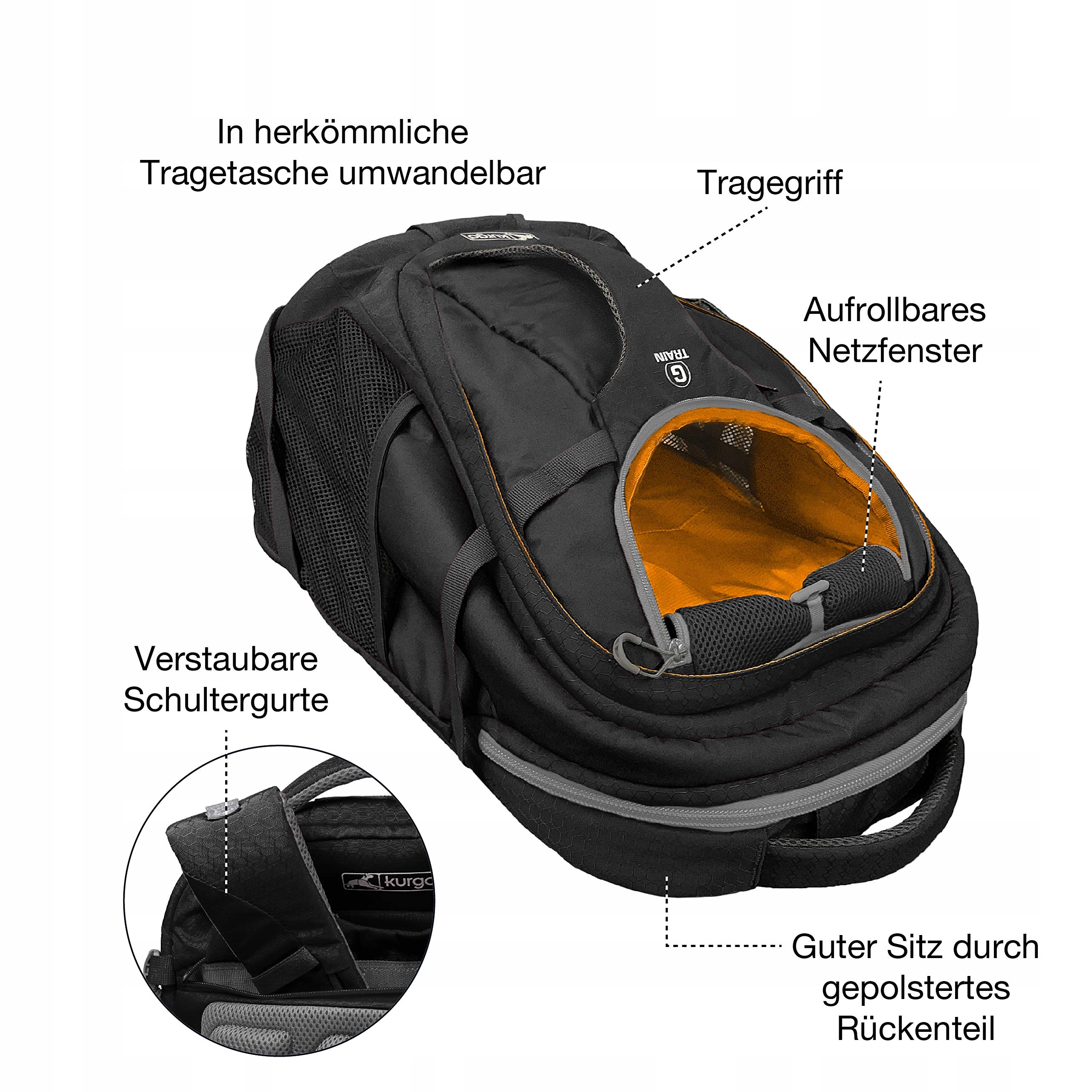 Kurgo G-Train Plecak dla psa, Z wbudowaną komorą dla zwierząt, Wodoodporny spód, Dla zwierząt do 11 kg, Czarny