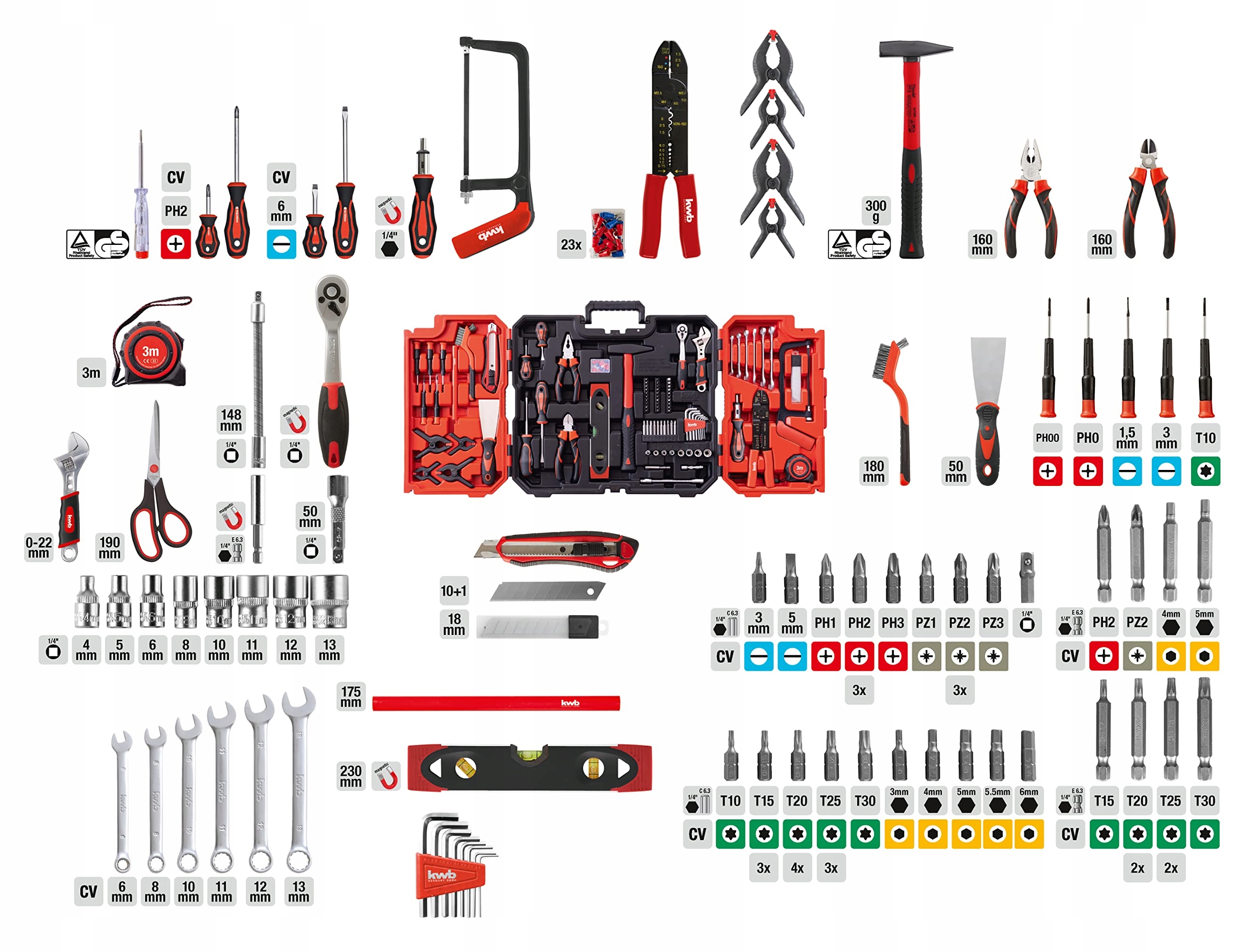 WYSOKIEJ JAKOŚCI: Młotek z certyfikatem TÜV/GS dla większego bezpieczeństwa, magnetyczny wkrętak, szpachelka, magnetyczna poziomica lub mata antypoślizgowa dla pewnego trzymania narzędzi to tylko niektóre z atrakcji tego wszechstronnie wyposażonego zestawu narzędziowego.