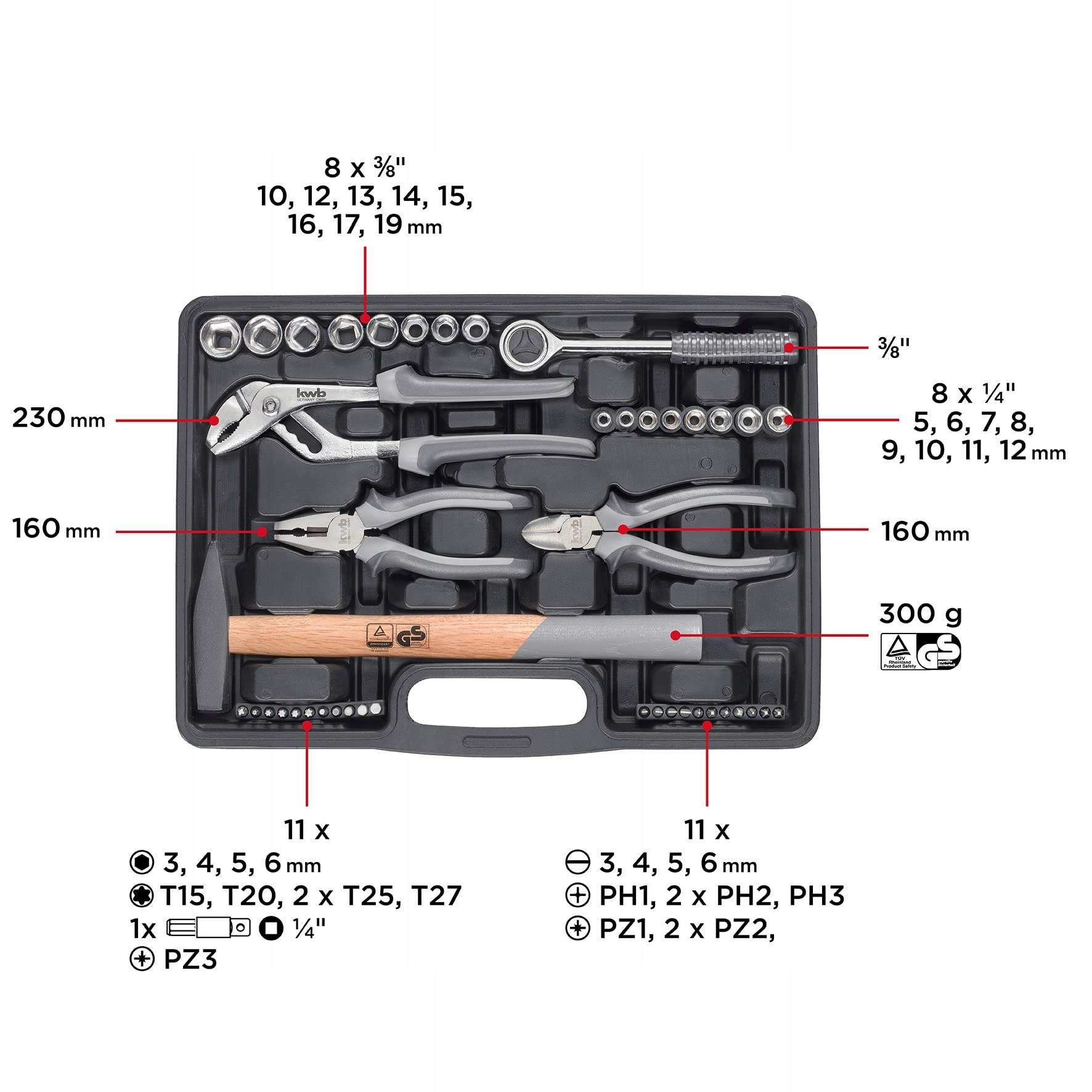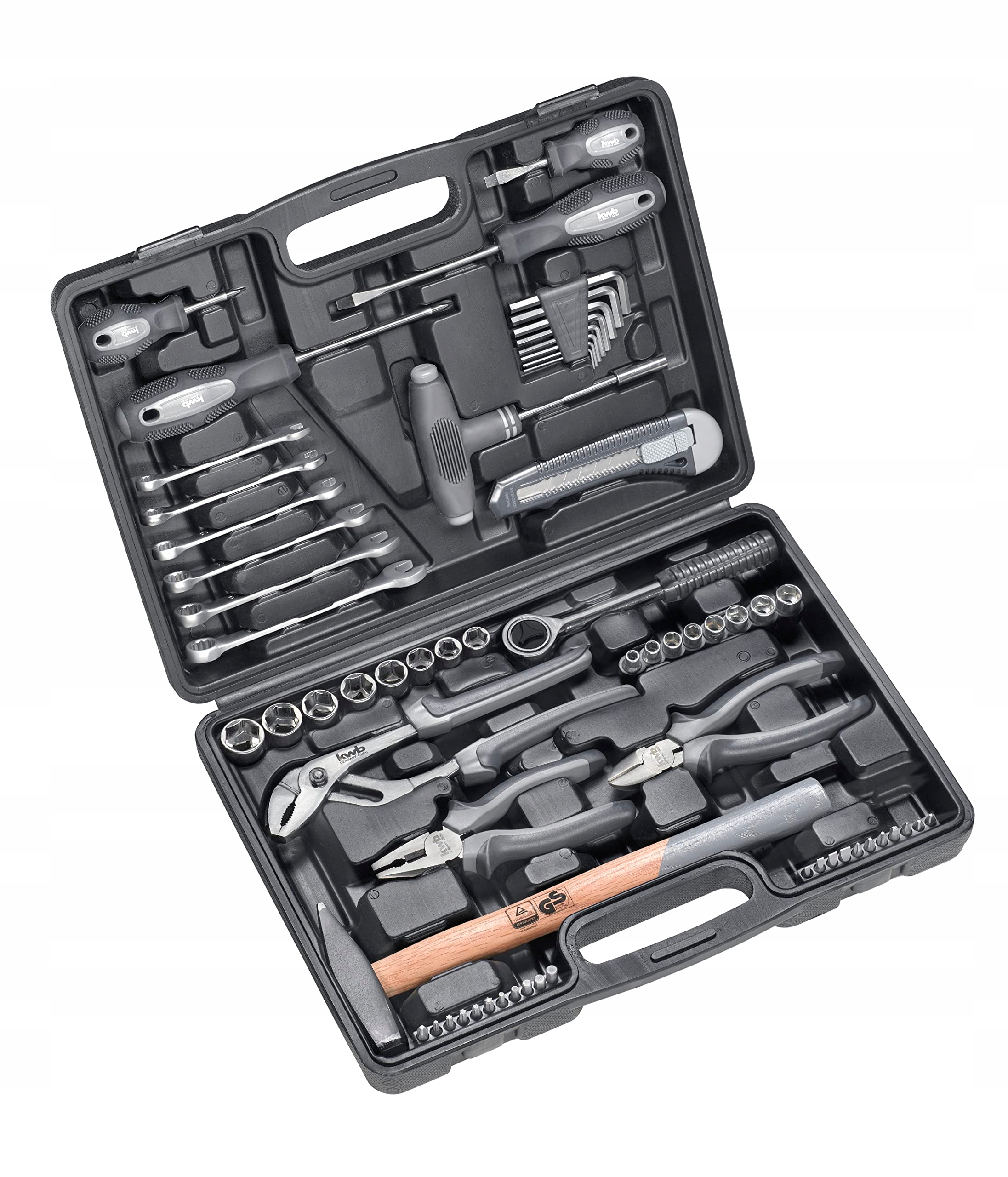 WSZECHSTRONNY: Wyposażona w najważniejsze narzędzia, 63-częściowa skrzynka narzędziowa kwb oferuje oprócz kluczy płaskich i różnych nasadek także przegubowy klucz, klucz sześciokątny oraz zestaw bitów do lekkich prac śrubowych.
