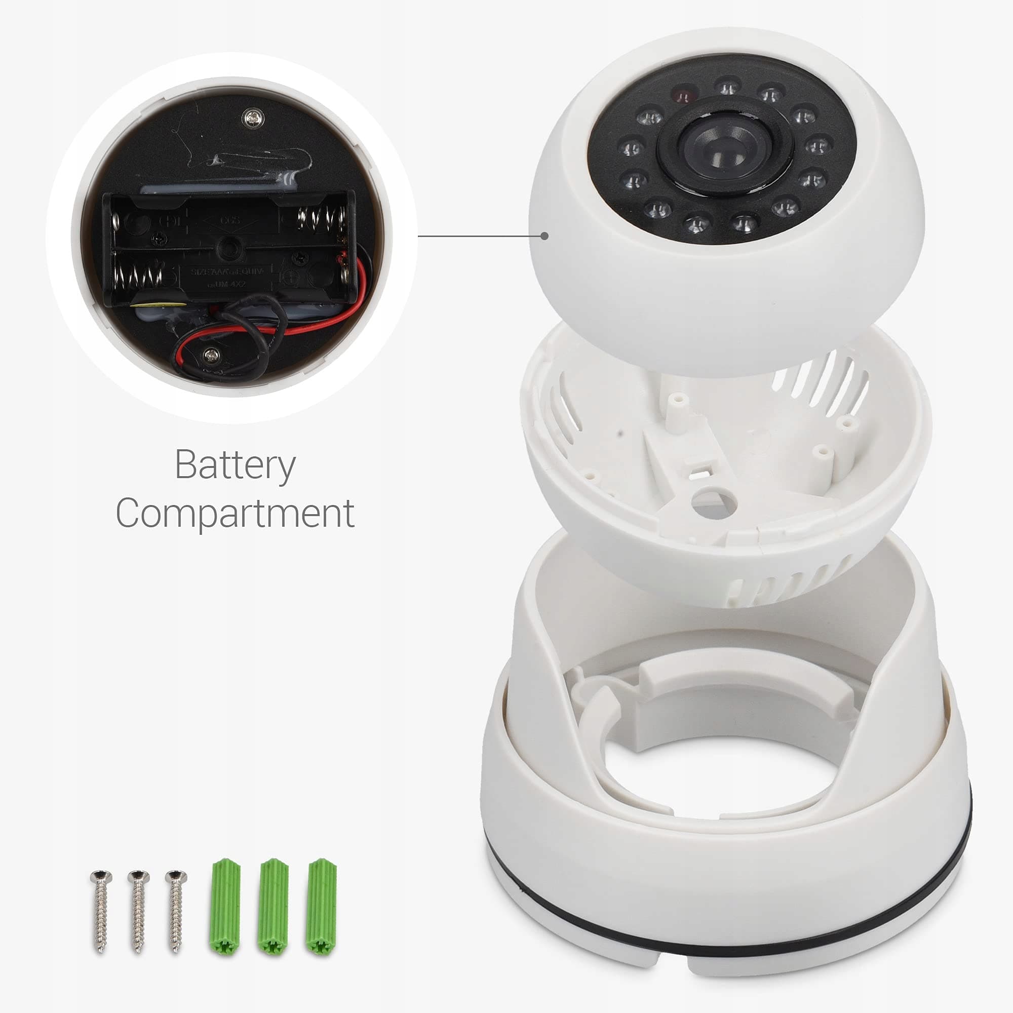 BATERYJNE ZASILANIE: Uruchomienie kamery atrapy odbywa się bezprzewodowo, potrzebne są jedynie 2x baterie AAA (nie dołączone).