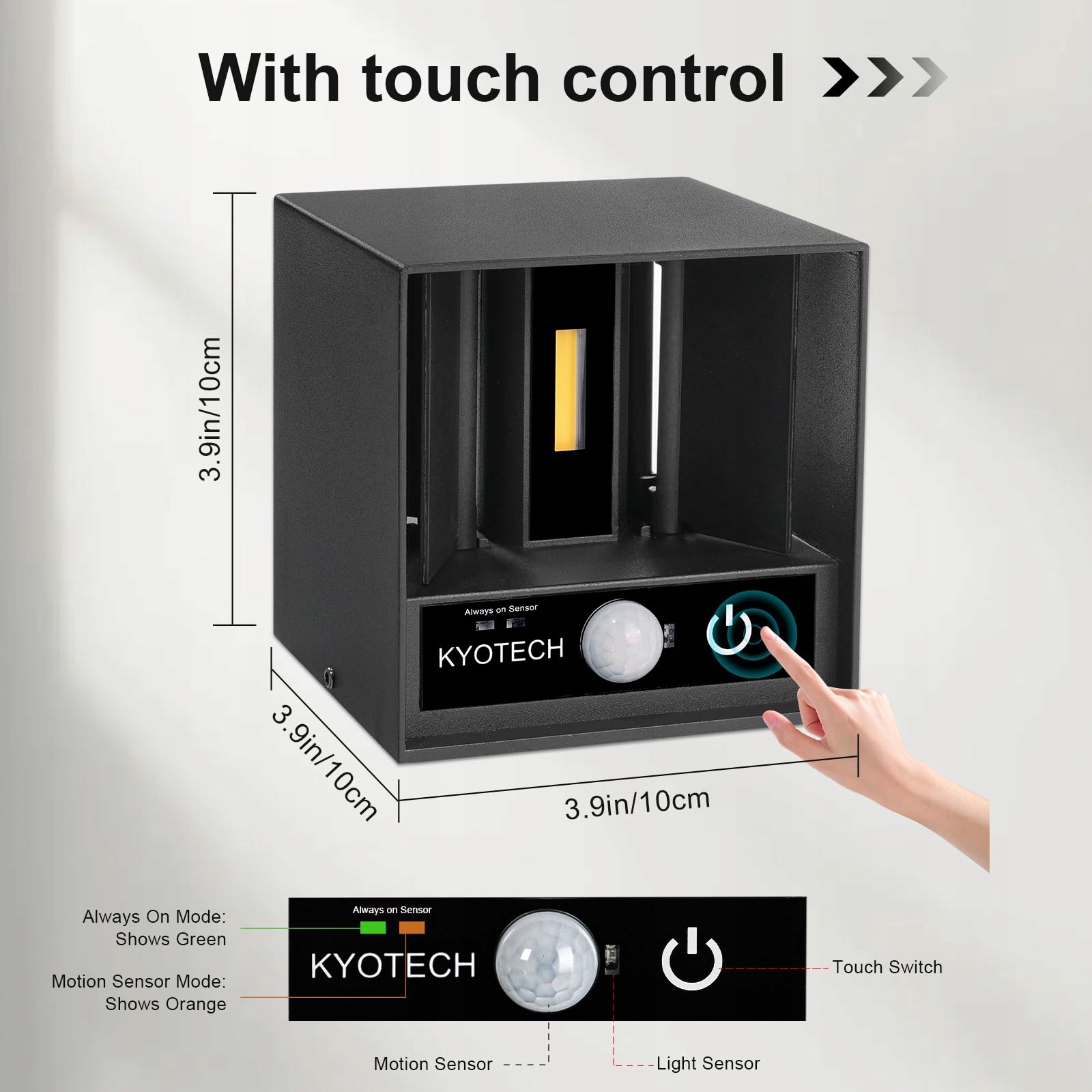 KYOTECH 2 sztuki LED zewnętrzne kinkiety z czujnikiem ruchu 12W IP65 1320LM LED lampa ścienna do wnętrz/na zewnątrz góra-dół czarny aluminium ciepła biel 3000K lampa zewnętrzna z dotykowym sterowaniem, regulowany kąt świecenia