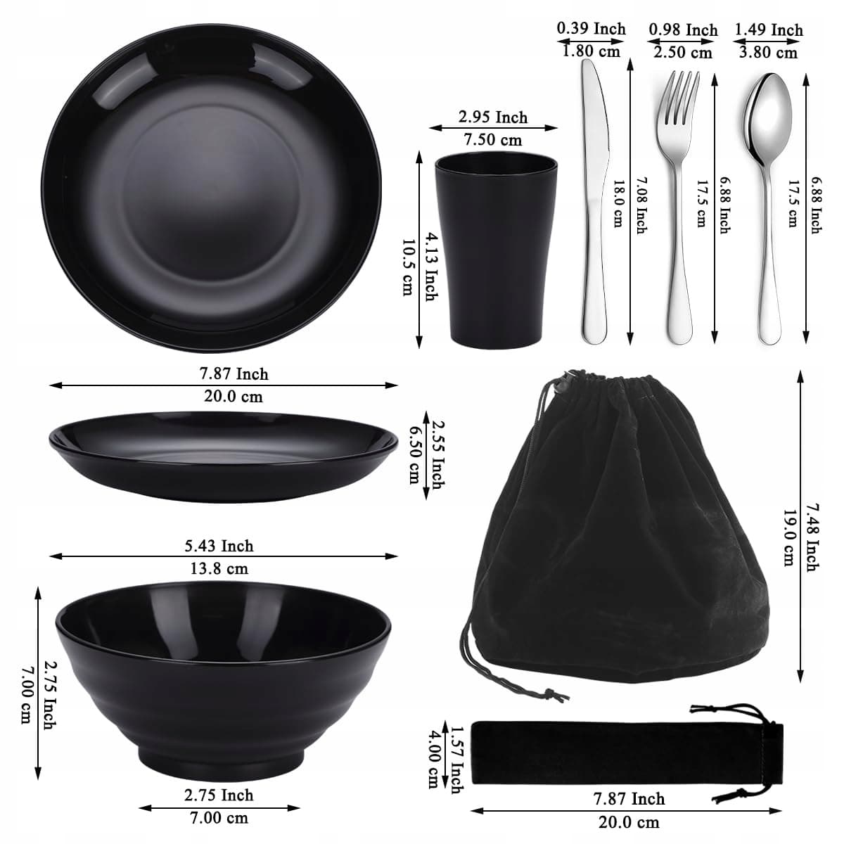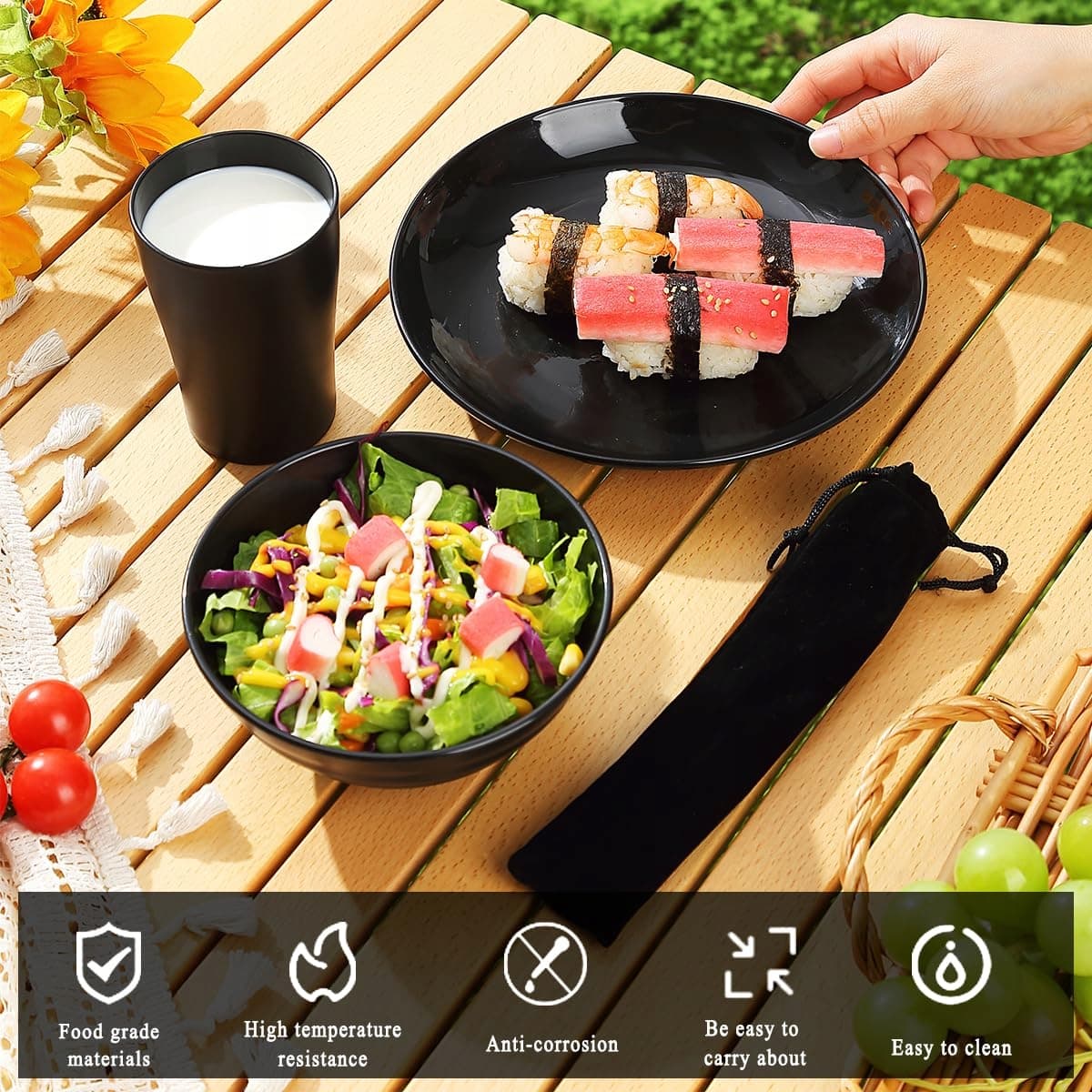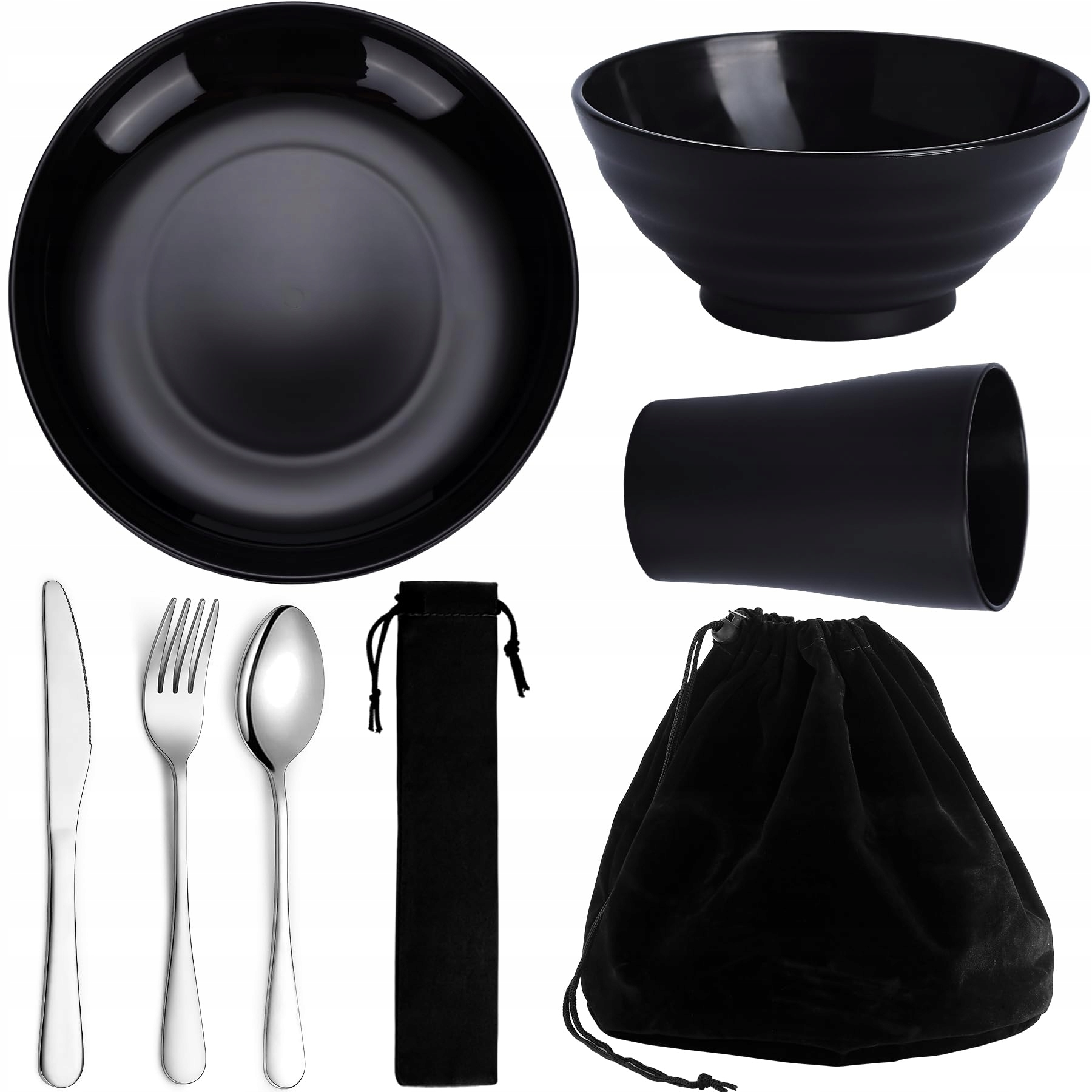 Zestaw sztućców Kyraton Camping, wielokrotnego użytku lekki kubek, miski, talerze i sztućce ze stali nierdzewnej z czarną torbą, nadające się do mycia w zmywarce
